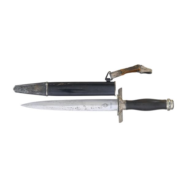 WITTE. This dagger measures 14 1/4" overall and features a plain blade with a raised medial ridge, marked on the reverse "(logo) KRONECK ERNST ERICH WITTE SOLINGEN." Plated eagle crossguard with oval banded pommel. Black grip featuring a central RLB star with blue enamel. Black enameled scabbard with plated mounts. Original leather hanger with belt clip marked "A DRGM." CONDITION: blade shows very light wear with some slight staining. Hilt shows light wear with minimal loss of finish. Grip has a few scuffs and dings, and there is a tiny bit of blue enamel missing from the RLB star. Scabbard shows light wear, with finish being better than 95% complete. Hanger is solid, but much of the black finish is worn. (02-23874/BF). $900-1,300.