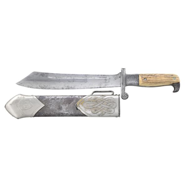 This hewer measures 15 5/8" overall and has a plain blade with a single narrow fuller. The blade is etched "Arbeit adelt." The reverse of the blade is marked "RADL" in a triangle and "GES GESCH AXT-UND HAUERFABRIK (logo) SOLINGEN." Iron hilt. Grip is a light-colored stag horn held in place by two screws. Scabbard had a black-painted finish with plated mounts. CONDITION: blade has a light gray patina with some minor staining. Hilt has universal spots of oxidation. Grips are undamaged. Scabbard has lost nearly all of its finish on the body. Mounts show light wear with some loss of plating at the very tip. One small screw is missing from the tip. (02-23648-2/BF). $600-800.
