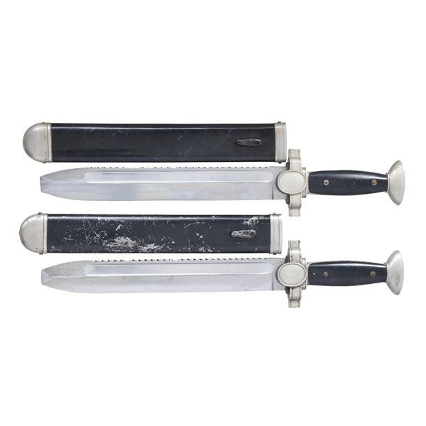 1) This dagger measures 16 3/8" overall with a plain, sawback, blunted blade featuring a fuller near the spine. The ricasso on the reverse is marked "GES. GESCHUTZT." Plated crossguard featuring a Red Cross eagle on the front oval languet. Two-piece composite grip, with the front grip being crosshatched. Plated oval, bowl-shaped pommel. Black enameled scabbard with plated mounts. CONDITION: blade shows scabbard wear. Hilt, grips, and scabbard all show light wear. 2) This dagger measures 16 3/8" overall with a plain, sawback, blunted blade featuring a fuller near the spine. The ricasso on the reverse is marked "GES. GESCHUTZT." Plated crossguard featuring a Red Cross eagle on the front oval languet. Two-piece composite grip, with the front grip being crosshatched. Plated oval, bowl-shaped pommel. Black enameled scabbard with plated mounts. CONDITION: blade shows scabbard wear and just a touch of very light oxidation. Hilt has a light gray patina. Both grips are intact and undamaged. There are a couple spots of light oxidation on the pommel. Scabbard finish is about 93%. (02-23868/BF). $800-1,100.