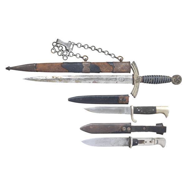 1) LUFTWAFFE. An example of a 1st Model Luftwaffe dagger with an overall length of 19 1/4". The blade is marked on the reverse "RICH. ABR. HERDER (logo) SOLINGEN." Plated crossguard and pommel, each with a central mobile Party symbol. Aluminum wire-wrapped blue leather grip. Blue leather-covered scabbard with plated mounts and original aluminum hanger attached. CONDITION: blade is dirty but would clean to quite nice. Hilt shows light to moderate wear with heavy tarnish and some abrasions to the grip. Scabbard has a heavy, oxidized finish on the mounts, and about 70% of the leather covering is missing. Hanger shows light wear. 2) HJ. An example of an HJ knife measuring 10" overall with an unengraved and unmarked blade. Two-piece black composite grip with a black, red, and white HJ diamond in the center of the front grip. Plated hilt and guard. Black enameled sheath with integral belt hanger. CONDITION: blade is generally good but does show some scratches that do not seem to be from sharpening. Front grip is undamaged. Rear grip is only 15% complete. Sheath body has lost most of its black finish. The leather hanger is complete and shows light wear. 3) SIDE KNIFE. An interesting pre-WWII side knife, likely from the Weimar era, measuring 11 1/4" overall. Plain blade, with a clipped point, marked on the ricasso with a king's head and a knight's head. Plated hilt with bird effigy pommel. Two-piece black composite grip and black leather, anodized sheath with a leather belt loop. CONDITION: the knife generally shows light wear overall. Sheath has 80% of its finish intact but is missing all but the base of the leather hanger. (02-23870/BF). $400-600.