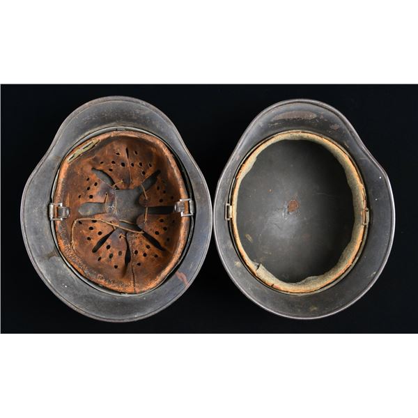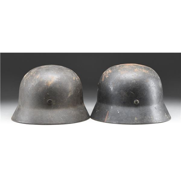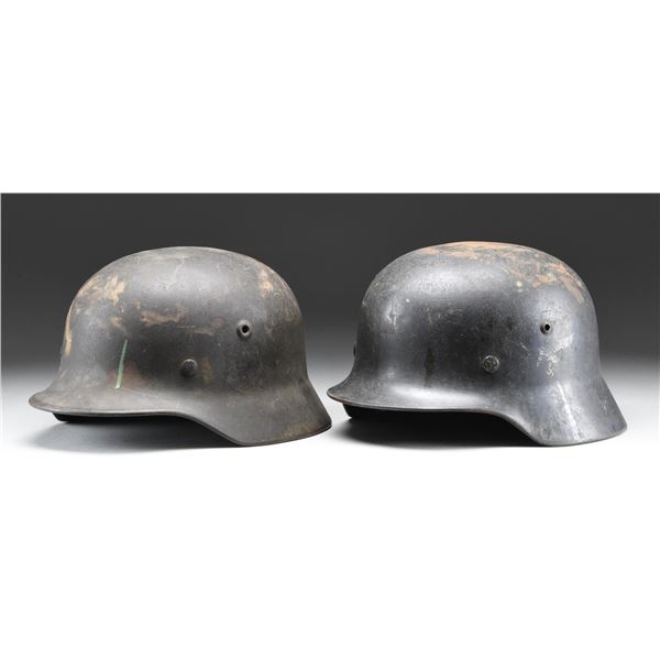 1) LUFTWAFFE. A well-used example of a Luftwaffe M1935 helmet showing a single Luftwaffe decal on the left-hand side. The helmet has a dark gray/blue-painted finish, with the ghost of a national shield decal on the right side together with the aforementioned Luftwaffe eagle on the left. The inside rear of the helmet is stamped "303" and the inside left is stamped "Q66". Eight-tongue leather liner with partial leather chinstrap. CONDITION: The helmet shows wear, particularly at the top, with two side-by-side dents resembling bullet strikes. The Luftwaffe decal is about 40%, and the national shield decal is not present, but an outline can be discerned. The interior is dry and flaked but complete. Chinstrap is only about 15% intact. 2) ARMY. An M1940 battle helmet with a dark gray/green-painted finish and no decals. The inside rear is stamped "DN194" and the inside left is stamped "Q64". There is no liner or chinstrap, but the band is present. CONDITION: The helmet finish is strong with minor oxidation. The band also has oxidation but remains complete. (02-23650/BF). $500-700.