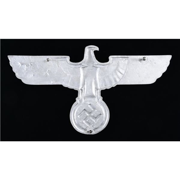 This aluminum train eagle measures approx. 24" x 13 1/4". It depicts a German eagle atop a wreath that surrounds a black-painted Party symbol. The reverse has two tapped holes at the top of each wing and another at the base of the wreath. These holes are fitted with steel screws of unknown age. The reverse is marked just under the eagle's neck "Wehag AL-MG-SI F13". "Wehag" is the acronym for "Werke der Stadt Halle AG", a factory in the city of Halle that produced train eagles like this example. CONDITION: The eagle shows light overall wear, with numerous casting flaws on the reverse. The paint on the Party symbol is about 50% intact. (02-23635/BF). $300-600.