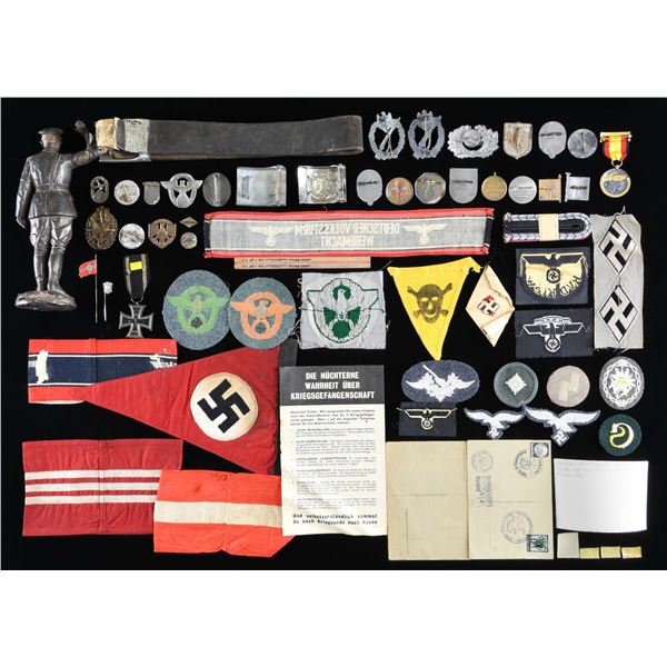 This large and varied lot includes 1 bronze statue of Adolf Hitler giving the fascist salute. The statue measures approx. 9 1/2" high and is marked on the underside of the base "__ 4. 1939 DER FUHRER". / 1 Army aluminum belt buckle with the original belt. / 3 stamps with an eagle and Party symbol for two weeks of disability insurance. / 1 stamp with the death mask of Reinhard Haydrich, valued at 60 pfennigs. / 1 photograph of Hitler looking at a river. / 1 Army cap wreath with central cockade. / 2 Infantry Assault Badges. / 2 plastic regimental standards. / 12 various tinnies. / 1 War Merit Medal with no ribbon or ring. / 1 HJ armband. / 2 HJ buckles. / 1 HJ tinnie. / 1 Hunting Association pin. / 1 HJ Membership pin. / 1 HJ Marksmanship pin. / 1 HJ sleeve diamond. / 2 "DEUTSCHER VOLKSSTURM WEHRMACHT" armbands. / 1 Wehrmacht Marksmanship lanyard shield. / 1 Spanish Civil War Campaign Medal of 1936. / 1 WWI Iron Cross, 2nd Class, with ribbon. / 1 Party pennant measuring 11 1/4" in length. / 1 postcard of Adolf Hitler. / 1 small tin battle flag, as carried by a toy soldier. / 1 early NSDAP political leader's armband for a Landsgeschaftsfuhrer. / 1 mine marking pennant. / 1 postcard that reads "DEUTSCHLAND SIEGT AN ALLEN FRONTEN FUR EUROPA." / 1 police cap eagle. / 1 solid black wound badge. / 1 railroad eagle for RVD Kiew. / 1 pair of unissued police shoulder straps, for a low-ranking officer, in its original wrapper. / 1 police green-on-white sports shirt eagle. / 1 police green sleeve eagle. / 1 police orange sleeve eagle. / 1 Panzer soft cap eagle. / 2 Luftwaffe breast eagles. / 1 Army cloth private's pip. / 1 Edelweiss patch of questionable age. / 1 black specialty patch. / 1 gray Luftwaffe specialty patch. / 1 flat bullion NSKK eagle on black. / 2 unissued HJ armband Party symbol diamonds. / 2 Wehrmacht-marked pencils. CONDITION: As expected, condition varies in this large lot; however, most items show light wear and are complete with no visible damage. (02-23636/BF). $1,200-1,600.