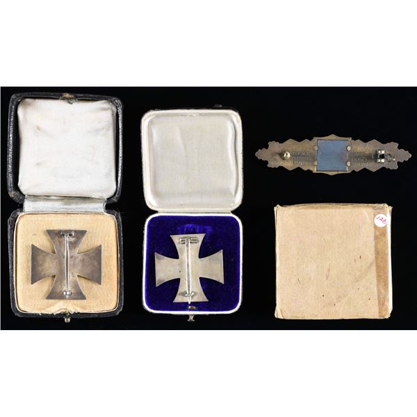 COMBAT AWARD. 1) WWI First Class Iron Cross with a magnetic center, in its original issue box with a Maltese cross on the top. Also included is the original cardboard storage box that reads "Eisernes Kreuz 1. Klasse. Nur von dem Bliehenen zu offnen". The top of the cardboard box has the name "Lt. Kahler" written in pencil. CONDITION: cross and case show light wear. Cardboard box shows moderate wear with some losses. 2) WWII First Class Iron Cross in its original issue box. The cross has a magnetic center and the box has a Maltese cross on the top. CONDITION: box shows light wear, particularly to the corners. Cross shows some wear to the finish. 3) WWII bronze Close Combat Award with a wide pin, marked on the reverse "FEC. W. E. PEEKHAUS BERLIN AUSF. A.G. M u. K. GABLONZ". CONDITION: clasp shows light wear overall. (02-23934/BF). $1200-1400.