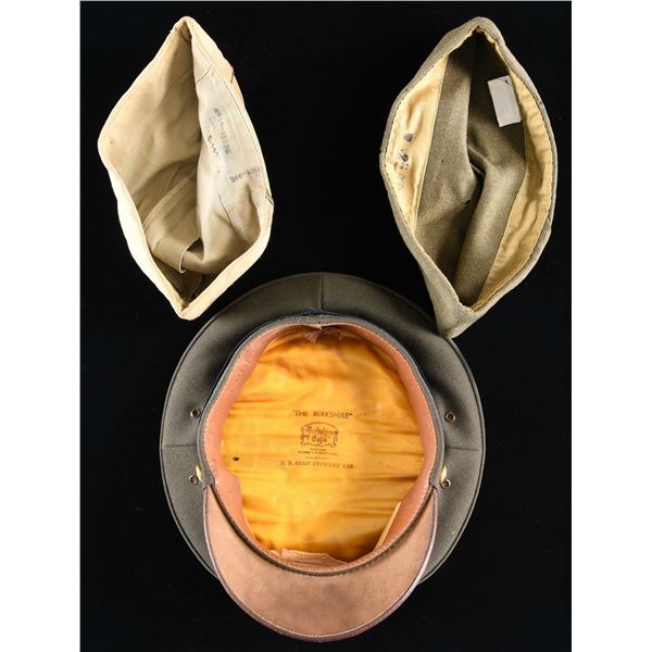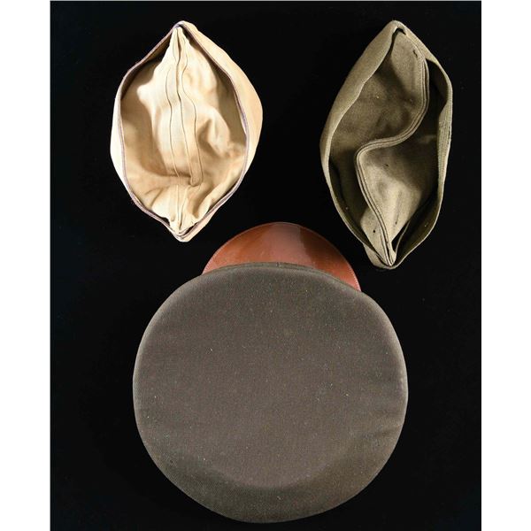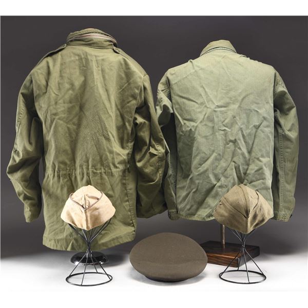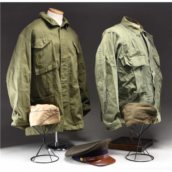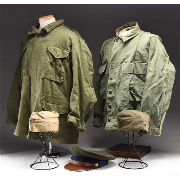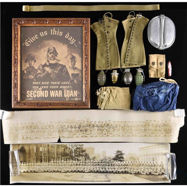 This lot includes 1 US military visor cap, likely from the 1930s, with an OD crown, navy blue mohair band, and brown leather chinstrap\visor. The interior is marked, in part, "Berkshire Caps U.S. ARMY OFFICERS' CAP". / 1 Panoramic photo of the "60th COLLEGE TRAINING DETACHMENT UNIVERSITY OF PITTSBURG". / 1 Panoramic photo of an unnamed WWI era unit. / 1 Medium-sized cold weather man's field coat, labeled, in part, "Stock No. 8415-00-782-2947 NATO\SIZE: 7080\3434". There are stains on the left breast pocket. / 1 US pineapple-style non-functional training grenade. / 1 US pineapple-style dewat training grenade. / 1 Spanish-American War-era dewat artillery screw-on nose fuse. / 1 US dewat fragmentation grenade. / 2 Overseas caps with insect damage. / 1 Khaki trouser belt. / 1 Pair of OD puttees. / 1 US M1911 clip pouch with a Swiss Army knife inside. / 1 M1945 mess kit. / 1 Khaki clothing storage bag. / 1 Blue denim clothing storage bag. / 1 US Army Korean War-era HBT utility shirt. / 1 Framed poster with a sight size of 14 3/4" x 18 1/2". The poster shows three American service men with a title above that reads "Give Us This Day…" and below reads "THEY GIVE THEIR LIVES-YOU LEND YOUR MONEY-SECOND WAR LOAN". The gold-wash wooden frame measures approx. 19" x 22". CONDITION: all items generally show light wear, except as noted. Poster remains crisp, and the frame shows only handling wear. (02-23778/BF). $400-550.