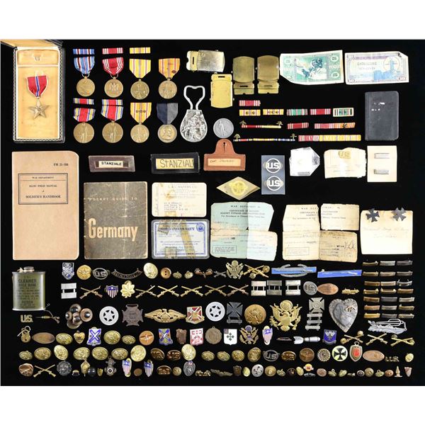 MORE. This lot includes 1 Bronze Star with ribbon in original case. / 1 Army Good Conduct Medal in original box. / 1 Asiatic-Pacific Campaign Medal in original box. / 1 American Campaign Medal in original box. / 2 WWII Victory Medals in original boxes. / 1 OD tin of bore cleaner. / 1 Completely filled-out 1941 miniature diary. / 1 Pair of 1889 Medical Corps collar insignia. / 1 Medium-sized bag of a large variety of WWII military buttons, collar insignia, and DIs. / 1 Asiatic-Pacific Campaign Medal with ribbon. / 1 WWII US Treasury award medallion for War Finance. / 1 French bottle opener. / 1 Small bag of ribbon bars and a lapel pin. / 1 Medium bag with a large variety of insignia, DIs, ribbon bars, and more, belonging to a soldier with the last name Stanziale. / 1 Booklet, dated 1941, titled "WAR DEPARTMENT BASIC FIELD MANUAL SOLDIER'S HANDBOOK." / 1 Booklet titled "POCKET GUIDE TO GERMANY." / 2 Fractional "MILITARY PAYMENT CERTIFICATES", likely from the 1960s. / 1 Small bag of rank insignia, collar insignia, and related items, likely belonging to the same solider. / 1 WWII-era sterling pilot's wings, measuring 1" in length. / 1 WWII-era sterling pilot's wings, measuring 3/4" in length. / 1 Reproduction Civil War Service Medal. / 1 US NR cap badge. / 2 Good luck tokens. / 8 Pieces of miscellaneous military and related insignia. / 1 Small bag containing a variety of pins, both military and civilian, along with three elongated cents. CONDITION: items do vary in condition; however, most show light wear and are complete. Germany booklet shows moderate to heavy wear. (02-23759-4/BF). $200-400.