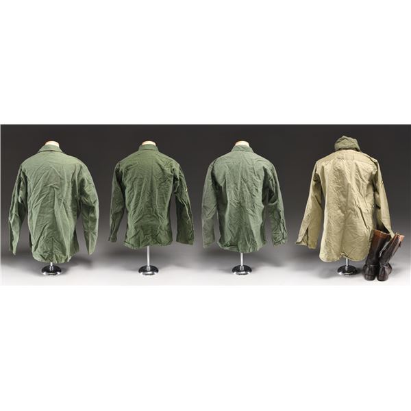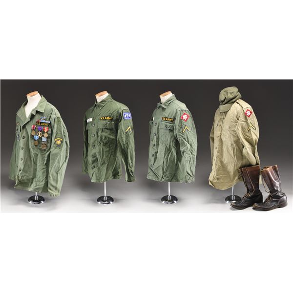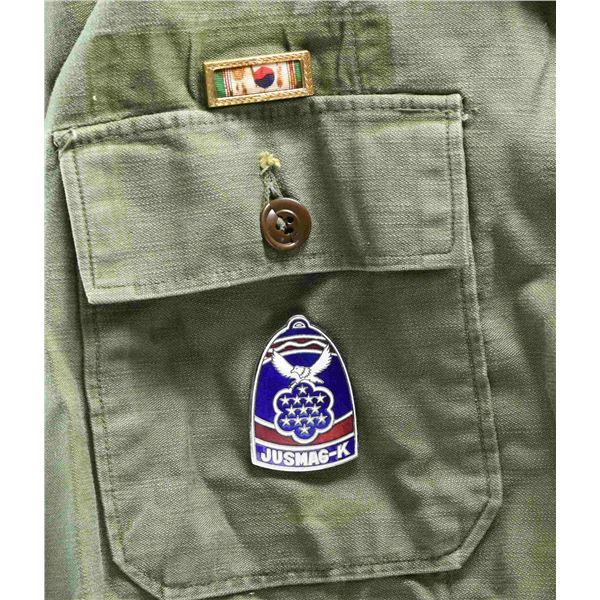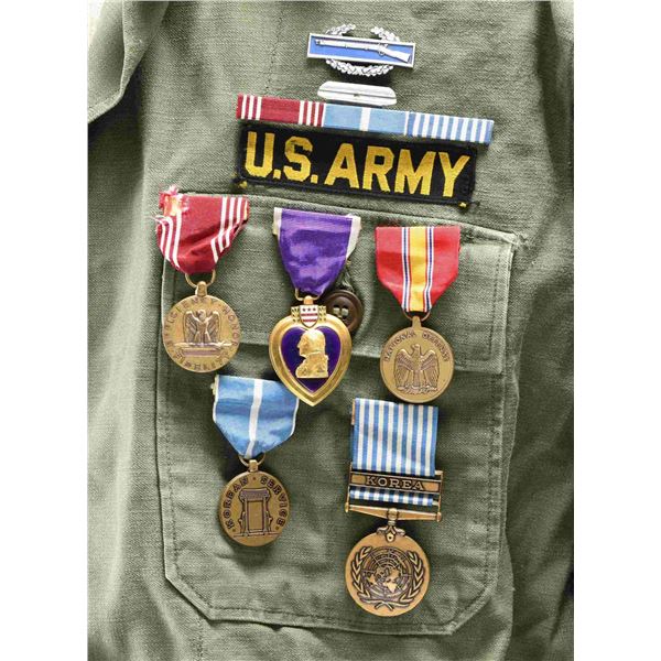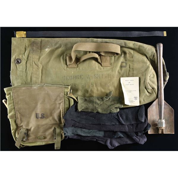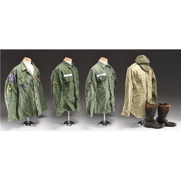 This lot includes an OD uniform shirt with SPEC5 stripes on both arms, and the right arm has a Korean Military Assistance Group patch with a KMAG patch below. Pinned to the left breast of the uniform is a small CIB, a four-award ribbon bar having a Purple Heart, Army Good Conduct, US Korean Service, UN Korean Service, an Army Good Conduct Medal, a Purple Heart, a National Defense Medal, a US Korean Service Medal, and a UN Korean Service Medal. The right breast has a Korean Presidential Unit Citation ribbon and an enamel badge of the Military Assistance Group with the letters "JUSMAG-K" at the base. The lot further includes one khaki uniform shirt, one OD uniform shirt for a private of the 4th Army, one OD field cap, one pair of brown leather boots, one OD uniform shirt for a private in the 2nd Corps, two pairs of dark wool socks, one black uniform belt, one entrenching shovel, one OD duffle bag, one OD glove, one OD backpack with "U.S." stenciled on the outside and a lengthy stencil on the inside with the date "1951", and a small booklet titled "HEAVY HINTS for LIGHT PACKS". CONDITION: all items generally show light wear. The boots and duffle bag show moderate wear. (02-23664/BF). $200-400.