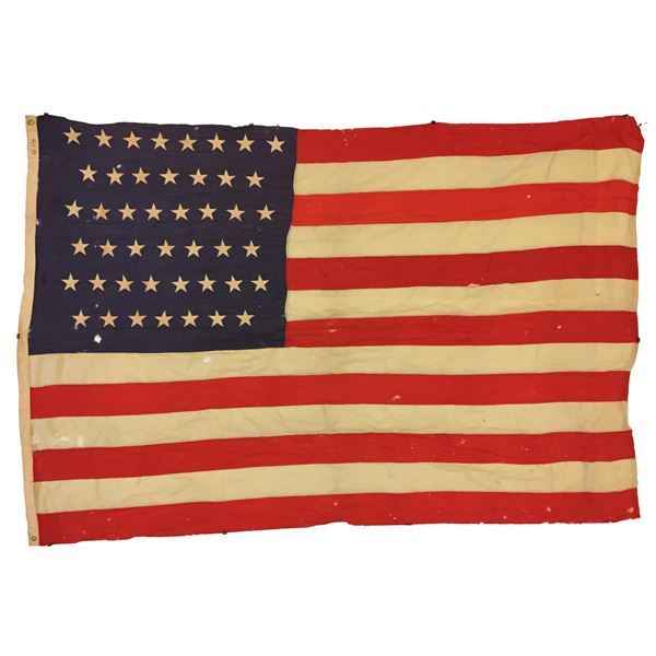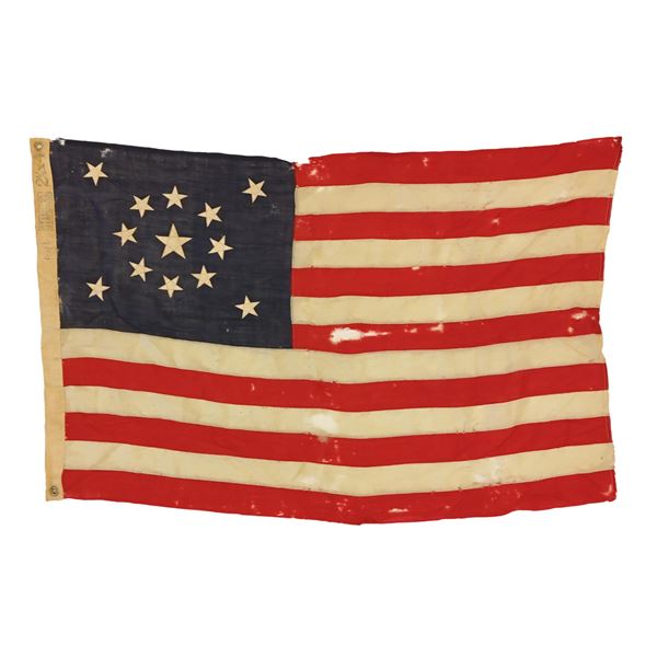 1) 45 STARS. A large 45-star flag, measuring approx. 70" x 98", was in use from 1896 with the admission of Utah until 1907 with the admission of Oklahoma as the 46th state. This flag is of standard design with a 1 3/4" heavy cotton hoist that is marked "6 X 9" and has one brass grommet on either end. CONDITION: The flag has numerous small holes and tears but remains substantially solid. 2) 13 STARS. A nice size 13-star patriotic flag measuring approx. 30" x 46". This flag likely dates from the very late 19th century to the early 20th century. It has one star in each corner of the canton with a ring of eight stars in the center and a larger central star. The 1 3/4" cotton hoist has a brass grommet on each end and is marked "STANDARD." in a rectangle and "2 1/2 X 4". CONDITION: This flag also has numerous small holes and tears throughout the flag, but, like the previous example, remains substantially solid. (02-23673/BF). $200-300.