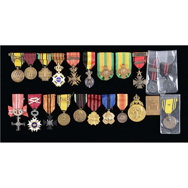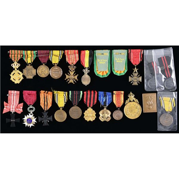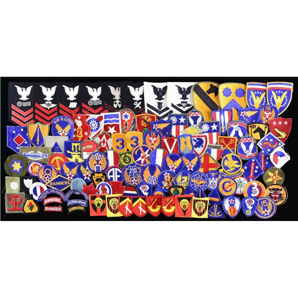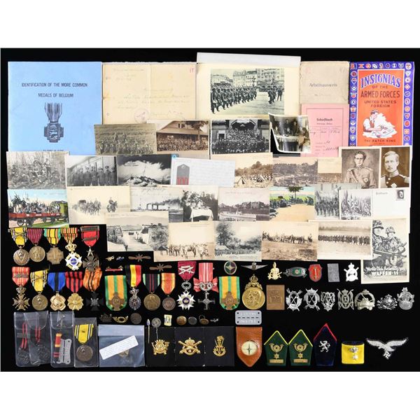 US PATCHES AND MORE. This varied and fascinating lot consists of 21 foreign medals, mostly of Belgian and Finnish origin. All but one of the medals have their original ribbons. / 1 book titled "IDENTIFICATION OF THE MORE COMMON MEDALS OF BELGIUM". / 1 compass. / 15 mostly Belgian cap badges and military insignia. / 9 foreign military patches. / 2 Finnish dog tags. / 1 Finnish ribbon bar. / 1 pair of Finnish shoulder tags. / 1 rectangular Belgian desk medal. / 1 WWI US collar disk. / 1 pair of Finnish wings. / 14 pieces of foreign military insignia. / 1 WWII German Luftwaffe breast eagle. / a small group of German post cards, photographs, and ephemera, including passes and documents. / 1 WWII German NSDAP tinnie. / 1 pamphlet titled "INSIGNIAS OF THE ARMED FORCES UNITED STATES FOREIGN". / approximately 104 United States military divisional and rank patches. Most appear to be of the WWII era. CONDITION: most items generally show light wear. Books and ephemera show some discoloration. PROVENANCE: The Estate Collection of Charles Wagner. (02-23937/BF). $400-700.