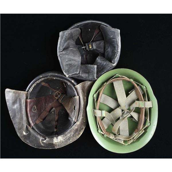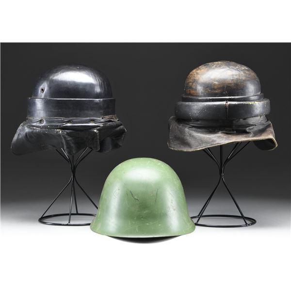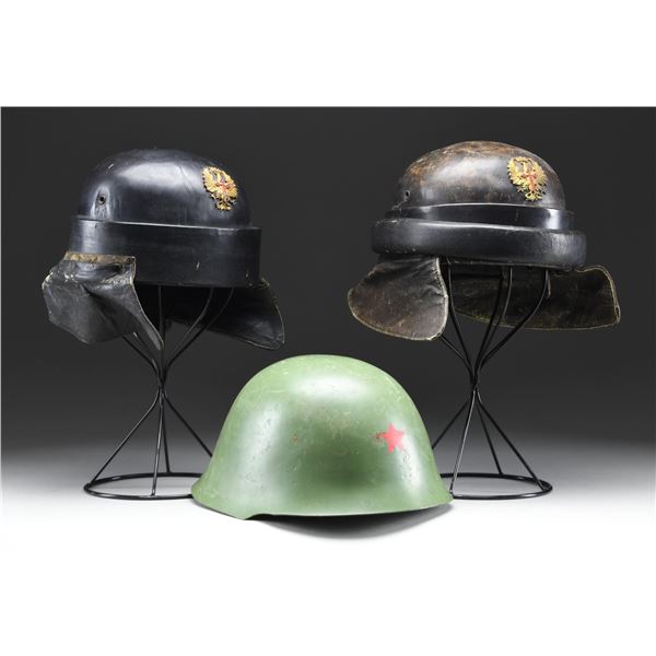 HELMET. 1) SPANISH. A Spanish M1935 motorcycle or tanker helmet. The leather has a dark brown finish with a padded band around the front. The front plate depicts a spread-wing gold eagle with a crown above it superimposed by a red Christian cross. Dark brown leather neck flap with brown leather chinstrap. CONDITION: helmet generally shows light to moderate wear but is complete and undamaged. 2) SPANISH. A Spanish M1935 motorcycle or tanker helmet. The leather has a dark brown finish. The front plate depicts a spread-wing gold eagle with a crown above it superimposed by a red Christian cross. Dark brown leather neck flap with brown leather chinstrap. CONDITION: The helmet generally shows light wear, but the padded band that encircles the helmet is missing. 3) SERBIAN. An interesting M59 Serbian helmet in a medium green paint with a red-painted star on the front. Full and complete liner with the original chinstrap. CONDITION: helmet shows light overall wear and retains 98% of its finish. (02-23656/BF). $300-500.