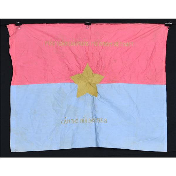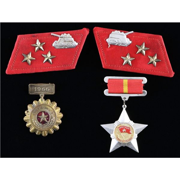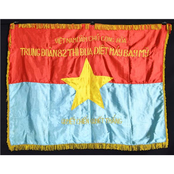 COLLAR TABS. This lot of North Vietnamese war mementos includes 1 flag measuring approx. 48" with fringe by 39" with fringe. The light blue and red silk-like flag is bordered on all four sides by 1 1/2" yellow fringe. The flag has a central yellow star and reads "VIETNAMDAN CHU CONG HOA TRUNG DOAN 82 THI DUA DIET MAY BAYMY" and "QUYET CHIEN QUYET THANG." / 1 Flag measuring approx. 32 1/2" x 26". The light blue and red cotton flag has a large central embroidered yellow star and reads "MAT TRAN GIAIPHONG MIEN NAM BIET NAM" and "CAN THO NOI DAY 1968." / 1 Star medal with a red ribbon that has a central yellow stripe. The front of the medal reads "QUYET THANG" and "CHIEN SY VE BANG." / 1 round medal, on a "1966" bar, that reads "CHIEN SI THI DUA." / 1 pair of red collar tabs with three stars and a silvered tank on each one. CONDITION: Silk-like flag shows very light wear. Cotton flag is a bit faded. Other items show light wear. (02-23772/BF). $200-350.