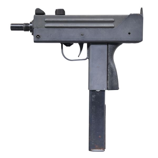 Cal. 380. S# SAP3801526. Bbl. 5". RPB's entry into the "Micro Mac" semiautomatic pistol market was the tiny M11-A1, open bolt pistol, chambered in .380 ACP. It was designated the M11-A1 so as not to be confused w/ their popular 9mm, M11 Submachine Gun. RPB M11-A1 serial numbers range from 380006 - 38011661. The semiautomatic variants were marked w/ the prefix SAP (semi auto pistol) or SAC (Semiautomatic carbine). While the traditional MAC 10 or even the 9mm M-11 were generally considered "boxey or chunky" in design, the M11-A1 is similar in size to the Colt 1911, though not quite as ergonomic in design. The suppressor users enjoyed the M11-A1s since standard 380 ammo is already subsonic, just like the 45ACP round and provided a very low sound signature when fired. Dark gray parkerized finish. Protected post front sight. Rear peep sight is a hole drilled in the rear receiver extension to coincide w/ the front sight. Slotted charging knob provides an unobstructed view. The action is locked by rotating the charging knob 90-degrees in the closed position. Safety is located on the right side of the receiver, inside the trigger guard. Threaded barrel w/ safety strap hanger. MAGS: 1 steel 32 rd. CONDITION: Finish is complete & consistent w/ some thinning on high spots & in areas of mechanical intervention, & typical drag lines on the sides. Bright bore w/ strong rifling. Fire control mechanism appears to function correctly when cycled by hand. PROVENANCE: Lifelong Collection of Terrance McCarty. (24-233/JZ). MODERN. $500-900.