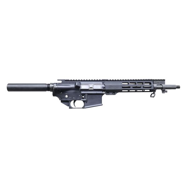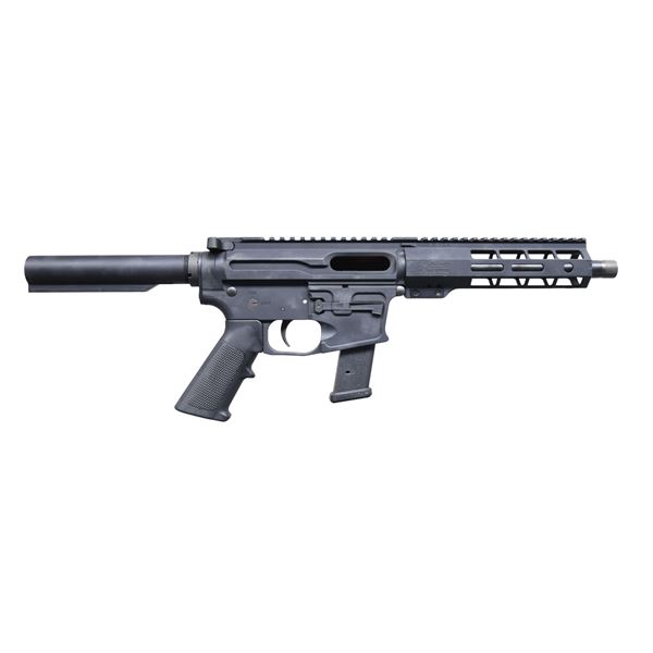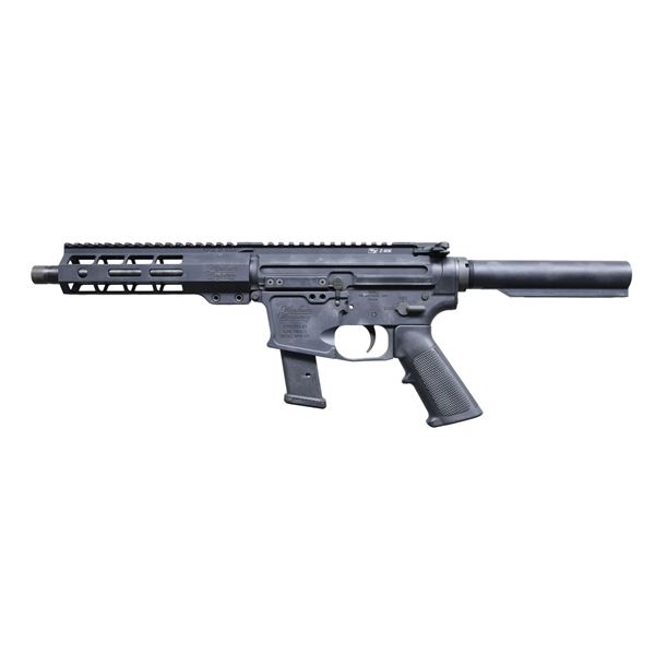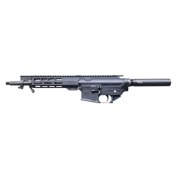 1) MODEL WW-PS PARTS GUN. Cal. 5.56mm. S# PS001295. Bbl. 12". Model WW-PS semi-automatic pistol mfg. by Windham Weaponry. Standard markings on left side of the receiver denoting the S#, model and cal. designations, as well as Windham's mfg. information. Aluminum receiver, flat top upper, buffer tube, and handguard exhibit a matte black finish, with the bbl. and gas block exhibiting a parkerized finish. Trigger assembly is present, with the remainder of small parts for the receiver being absent. Charging handle, bolt assembly, and flash hider are absent. UNATTACHED ACCESSORIES: plastic bag containing a black textured rubber Hogue grip, as well as several small parts. CONDITION: good, with metal components retaining the vast majority of their original factory finishes, exhibiting a few superficial handling marks overall. Mirror chrome lined bore, retaining well defined rifling throughout. (24-7044/MLW). MODERN. 2) MODEL WW-SP WITH HARD CASE. Cal. 9mm NATO. S# SP000261. Bbl. 9". Model WW-SP semi-automatic pistol mfg. by Windham Weaponry. Left side of the receiver exhibits standard markings denoting the S#, model and cal. designations, as well as Windham's mfg. information. Aluminum receiver, flat top upper, buffer tube, and handguard exhibit a matte black finish, with the threaded bbl. exhibiting a blue finish. A2 pattern checkered black polymer pistol grip. Receiver retains a partial trigger assembly. Bolt is absent. MAGS: 1 17-rd. PMAG. UNATTACHED ACCESSORIES: black plastic hard case. CONDITION: good, with some light wear from use and some superficial marks from handling and storage. Mirror bore, exhibiting some firing residue, while retaining well defined rifling throughout. Grip is very good overall. Case is missing one of its latches. (24-7045/MLW). MODERN. $600-900.