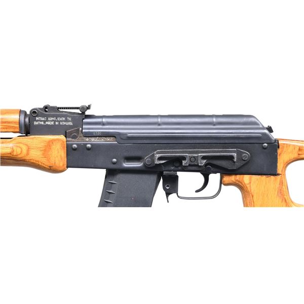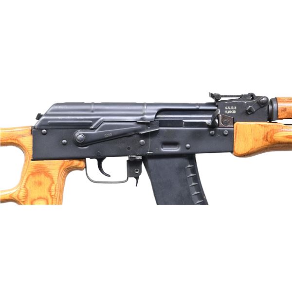 Cal. 5.45x39mm. S# 3-03102. Bbl. 16 1/4". C.U.R.2 semi-automatic rifle mfg. in Romania by RATMIL and imported by Intrac. Left side of the rear sight block is marked with Intrac's importer information above "RATMIL, MADE IN ROMANIA", with "C.U.R.2/ 5,45x39" marked on the right. Metal components exhibit a dull blue finish overall. Laminated wood thumbhole buttstock, with brown bakelite grip cap, and laminated wood handguards. Pinned and welded threaded muzzle cap, with open top post front sight, standard AK pattern rear sight, and integral AK pattern optic side rail mount. Matching number "6336" is present on the receiver cover, bolt carrier, bolt, and gas cyl. tube. MAGS: 2 black polymer 30-rd. mags., and 1 blued steel 5-rd. CONDITION: good, with metal components retaining the majority of their original factory blue finish, exhibiting some scattered superficial handling marks overall. Brilliant mirror chrome lined bore, retaining well defined rifling throughout. Wood furniture is very good overall. (25-528/MLW). MODERN. $500-800.