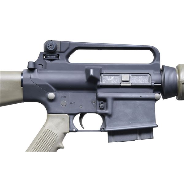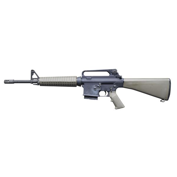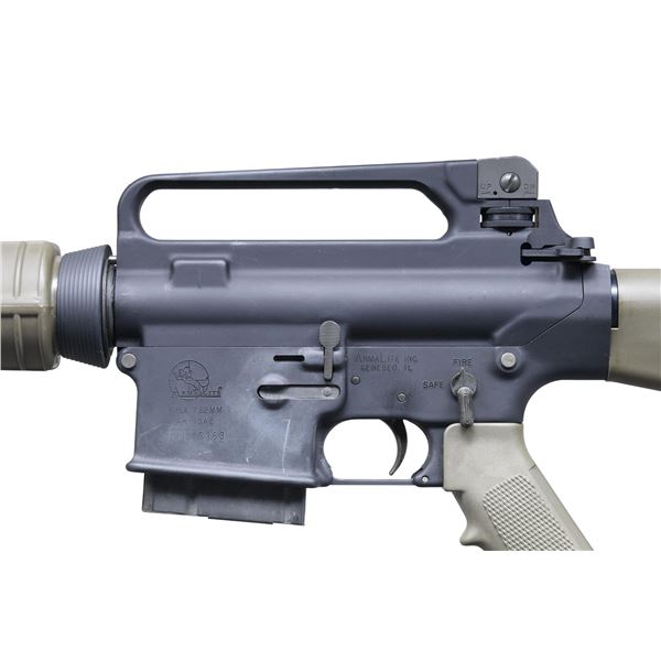RIFLE WITH MATCHING FACTORY BOX. Cal. 7.62mm. S# US55363. Bbl. 16 1/2". AR-10A2 Carbine semi-automatic rifle mfg. by Armalite. Left side of the receiver is marked with the Armalite logo above "RIFLE 7.62MM/ AR-10A2" and the S#, with Armalite's mfg. information marked towards the selector. Front of mag. well is marked with a faux factory applied white Department of Defense cartouche. Aluminum receiver and upper exhibit a matte black finish, with the bbl. and bolt exhibiting a parkerized finish. OD polymer A2 pattern fixed buttstock, checkered A2 pattern pistol grip, and ribbed handguards. Post front sight, with dual aperture flip-up rear sight. MAGS: 2 10-rd. and 4 20-rd. mags. UNATTACHED ACCESSORIES: matching factory box. CONDITION: near new, with metal components retaining bountiful amounts of their original factory finishes, exhibiting some light superficial handling marks overall. Brilliant mirror chrome lined bore, retaining well defined rifling throughout. Polymer furniture is excellent overall. Box shows light to mild superficial wear from handling and storage, but otherwise remains sturdy and serviceable. (25-671/MLW). MODERN. $900-1,200.