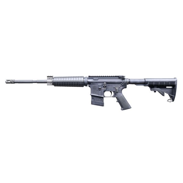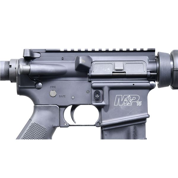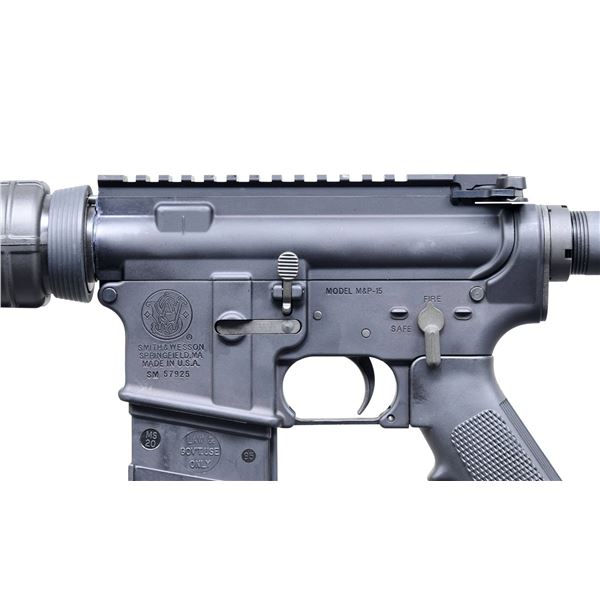 WITH MATCHING FACTORY HARD CASE & BOX. Cal. 5.56mm. S# SM57925. Bbl. 16 1/2". Model M&P-15 semi-automatic rifle mfg. by Smith & Wesson. Left side of the receiver is marked with the S&W trademark logo above S&W's mfg. information and the S#, with "MODEL M&P-15" marked towards the selector lever. Right side of mag. well is marked with a stylized "M&P 15". Top of the M4 profile bbl. is marked "5.56 NATO 1/9". Aluminum receiver and flat top upper exhibit a matte black finish, with the bbl. and gas block exhibiting a parkerized finish. Black polymer adj. buttstock, with checkered A2 pattern pistol grip, and short ribbed handguards. MAGS: 1 LEO marked Master Molder black polymer 20-rd. UNATTACHED ACCESSORIES: matching factory cardboard box containing a matching black plastic hard case. CONDITION: excellent, with metal components retaining bountiful amounts of their original factory finishes, exhibiting some light superficial handling marks overall. Brilliant mirror chrome lined bore, retaining well defined rifling throughout. Black polymer furniture is excellent overall. Box shows some light to mild exterior wear, but otherwise remains sturdy and serviceable. (25-672/MLW). MODERN. $800-1,200.
