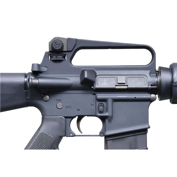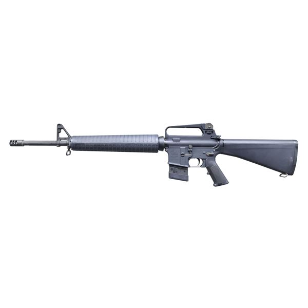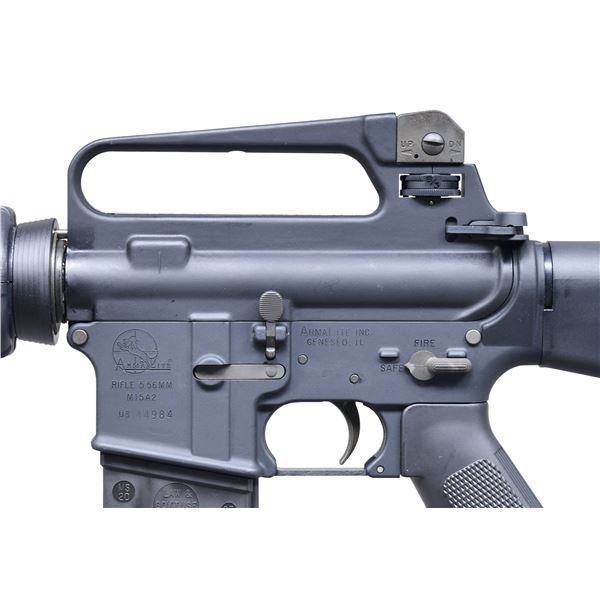 FACTORY BOX. Cal. 5.56mm. S# US44984. Bbl. 20 1/2". M15A2 semi-automatic rifle mfg. by Armalite. Left side of the receiver is marked with the Armalite logo above "RIFLE 5.56MM/ M15A2" above the S#, with Armalite's mfg. information marked towards the selector. Front of mag. well is marked with a faux factory applied white Department of Defense cartouche. Aluminum receiver and upper exhibit a matte black finish, with the bbl. and bolt exhibiting a parkerized finish. Black polymer fixed A2 pattern buttstock, with checkered A2 pattern pistol grip, and ribbed handguards. Post front sight, with dual aperture flip-up rear sight. MAGS: 1 LEO marked Master Molder 20-rd. and 1 30-rd. PMAG. UNATTACHED ACCESSORIES: non-matching factory box. CONDITION: excellent, with metal components retaining bountiful amounts of their original factory finishes overall. Brilliant mirror chrome lined bore, retaining well defined rifling throughout. Black polymer furniture is excellent overall. Box shows some wear and staining, but otherwise remains sturdy and and serviceable. (25-670/MLW). MODERN. $800-1,100.