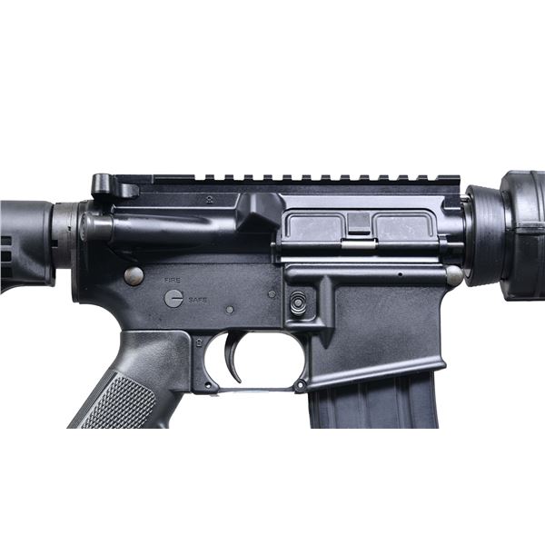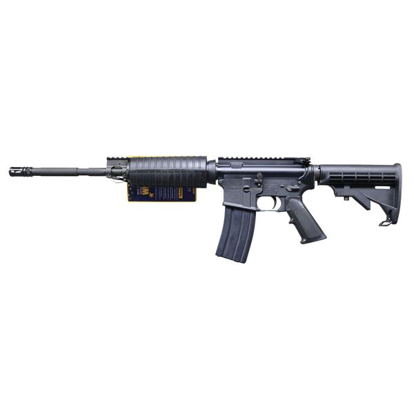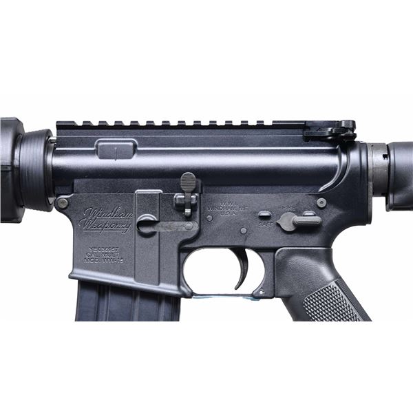 SEMI-AUTOMATIC RIFLE WITH HARD CASE. Cal. 5.56mm. S# YE036957. Bbl. 16 1/2". Model WW-15 semi-automatic rifle mfg. by Windham Weaponry. Left side of the receiver exhibits standard markings denoting the S#, model and cal. designations, as well as Windham's mfg. information. Top of the M4 profile bbl. is marked "WW 5.56 1/9". Receiver and flat top upper exhibit a matte black finish, with the bbl. and gas block exhibiting a parkerized finish. Black polymer adj. buttstock, A2 pattern checkered pistol grip, and short ribbed handguards. MAGS: 1 factory aluminum 30-rd. UNATTACHED ACCESSORIES: black plastic hard case. CONDITION: near new, with metal components retaining virtually all of their original factory finishes overall. Front sling loop retains its factory hang tag. Brilliant mirror chrome lined bore, retaining well defined rifling throughout. Black polymer furniture is excellent overall. (24-7047/MLW). MODERN. $400-600.