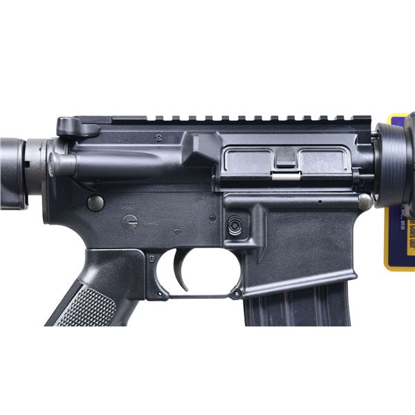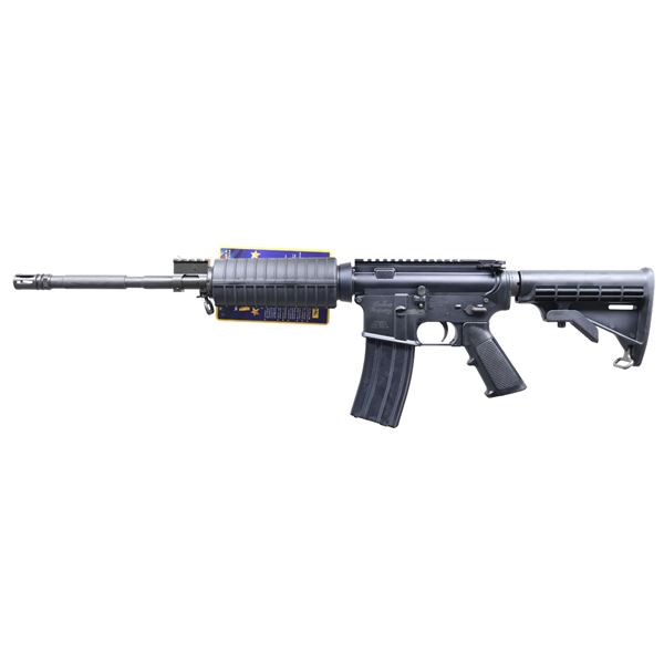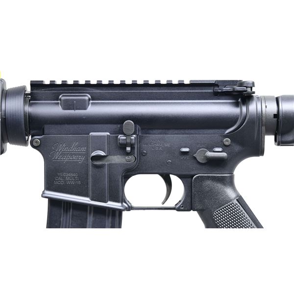 RIFLE WITH MATCHING BOX. Cal. 5.56mm. S# YE034540. Bbl. 16". Model WW-15 semi-automatic rifle mfg. by Windham Weaponry. Left side of the receiver exhibits standard markings, stipulating Windham's mfg. information, the model and cal. designations, as well as the S#. Top of the M4 profile bbl. is marked "WW 5.56 1/9". Aluminum receiver and flat-top upper assembly exhibit a matte black finish, with the bbl. and gas block exhibiting a parkerized finish. Black polymer collapsible buttstock with A2 pattern pistol grip and short ribbed handguard. MAGS: One aluminum 30-rd. UNATTACHED ACCESSORIES: Black plastic hard case with matching cardboard box. CONDITION: Near new, with metal components retaining virtually all of their original factory finishes overall. Front sling loop retains its Windham Weaponry tag. Mirror chrome-lined bore, retaining well-defined rifling throughout. Black polymer furniture is excellent overall. Box shows some light exterior wear from handling and storage, but otherwise remains sturdy and serviceable. (24-7057/MLW). MODERN. $400-600.