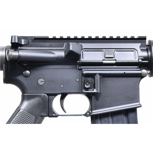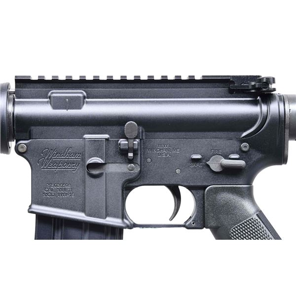 SEMI-AUTOMATIC RIFLE WITH HARD CASE & MATCHING BOX. Cal. 5.56mm. S# YE036598. Bbl. 16 1/2". Model WW-15 semi-automatic rifle mfg. by Windham Weaponry. Left side of the receiver exhibits standard markings denoting the S#, model and cal. designations, as well as Windham's mfg. information. Top of the M4 profile bbl. is marked "WW 5.56 1/9". Aluminum receiver and flat top upper exhibit a matte black finish, with the bbl. and gas block exhibiting a parkerized finish. Black polymer adj. buttstock, with checkered A2 pattern pistol grip, and short ribbed handguards. MAGS: 1 factory aluminum 30-rd. UNATTACHED ACCESSORIES: matching cardboard box, containing a black plastic hard case. CONDITION: near new, with metal components retaining virtually all of their original factory finishes overall. Front sling loop retains its factory hang tag. Brilliant mirror chrome lined bore, retaining well defined rifling throughout. Black polymer furniture is excellent overall. Box shows some light to mild exterior wear from handling and storage, but otherwise remains sturdy and serviceable. (24-7062/MLW). MODERN. $400-600.