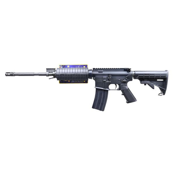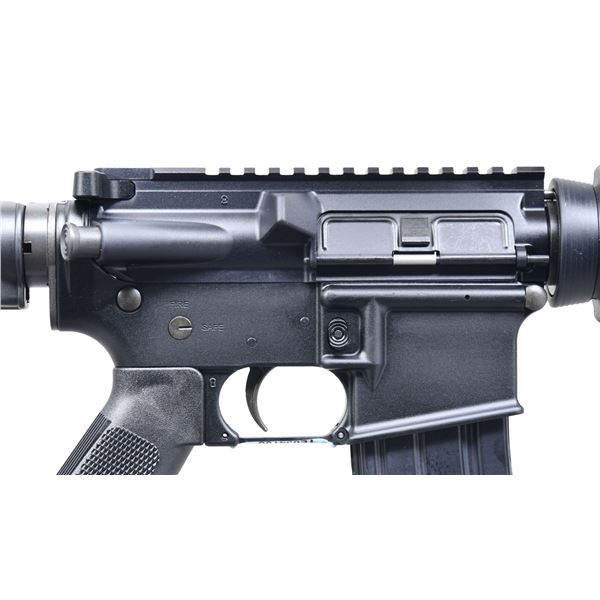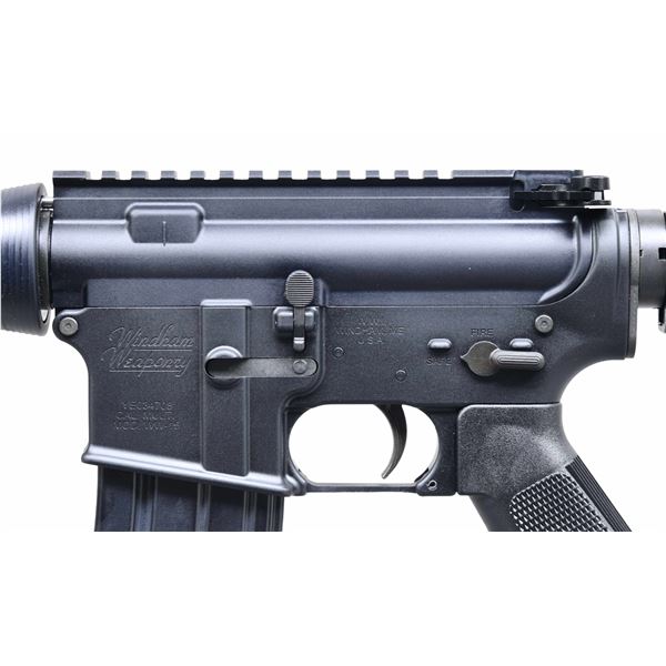 SEMI-AUTOMATIC RIFLE WITH HARD CASE & MATCHING BOX. Cal. 5.56mm. S# YE034708. Bbl. 16 1/2". Model WW-15 semi-automatic rifle mfg. by Windham Weaponry. Left side of the receiver exhibits the usual markings denoting the S#, model and cal. designations, as well as Windham's mfg. information. Top of the M4 profile bbl. is marked "WW 5.56 1/9". Aluminum receiver and flat top upper exhibit a matte black finish, with the bbl. and gas block exhibiting a parkerized finish. Black polymer adj. buttstock, with A2 pattern checkered pistol grip, and short ribbed handguards. MAGS: 1 factory aluminum 30-rd. UNATTACHED ACCESSORIES: matching cardboard box, containing a black plastic hard case. CONDITION: near new, with metal components retaining virtually all of their original factory finishes overall. Brilliant mirror chrome lined bore, retaining well defined rifling throughout. Black polymer furniture is excellent overall. Box shows some light to mild wear from handling and storage, but otherwise remains sturdy and serviceable. (24-7063/MLW). MODERN. $400-600.