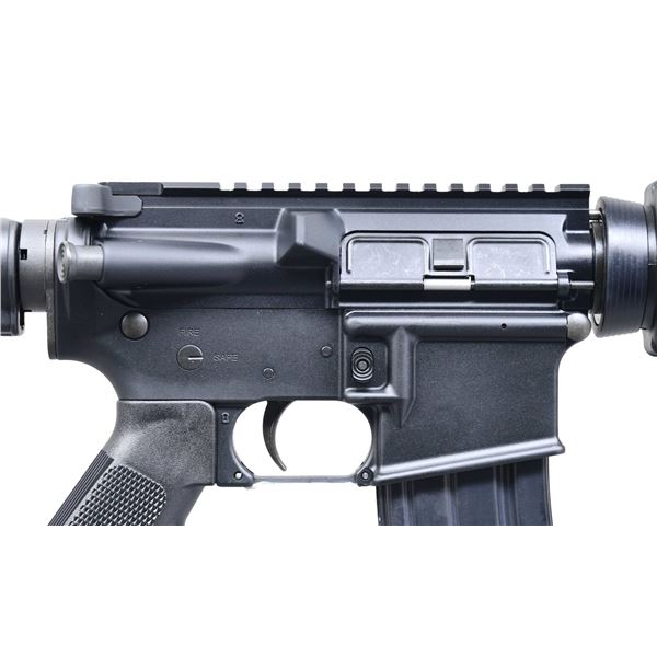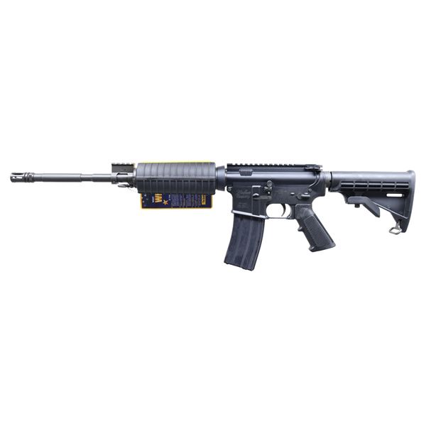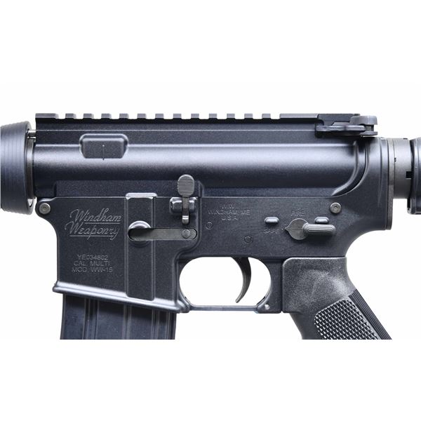 SEMI-AUTOMATIC RIFLE WITH HARD CASE & MATCHING BOX. Cal. 5.56mm. S# YE034802. Bbl. 16 1/2". Model WW-15 semi-automatic rifle mfg. by Windham Weaponry. Left side of the receiver exhibits standard markings stipulating the S#, model and cal. designations, as well as Windham's mfg. information. Top of the M4 profile bbl. is marked "WW 5.56 1/9". Aluminum receiver and flat top upper exhibit a matte black finish, with the bbl. and gas block exhibiting a parkerized finish. Black polymer adj. buttstock, with checkered A2 pattern pistol grip, and short ribbed handguards. MAGS: 1 factory aluminum 30-rd. UNATTACHED ACCESSORIES: matching cardboard box, containing a black plastic hard case. CONDITION: near new, with metal components retaining virtually all of their original factory finishes overall. Front sling loop retains its factory hang tag. Brilliant mirror chrome lined bore, retaining well defined rifling throughout. Black polymer furniture is excellent overall. Box shows light to mild wear from handling and storage, but otherwise remains sturdy and serviceable. (24-7065/MLW). MODERN. $400-600.
