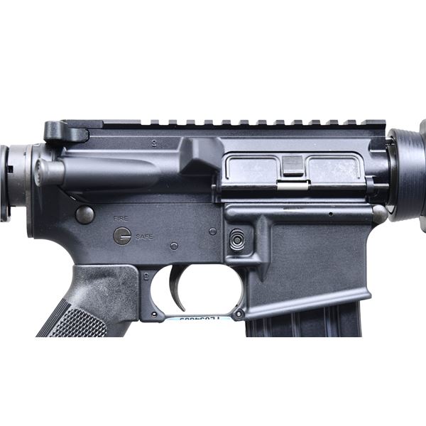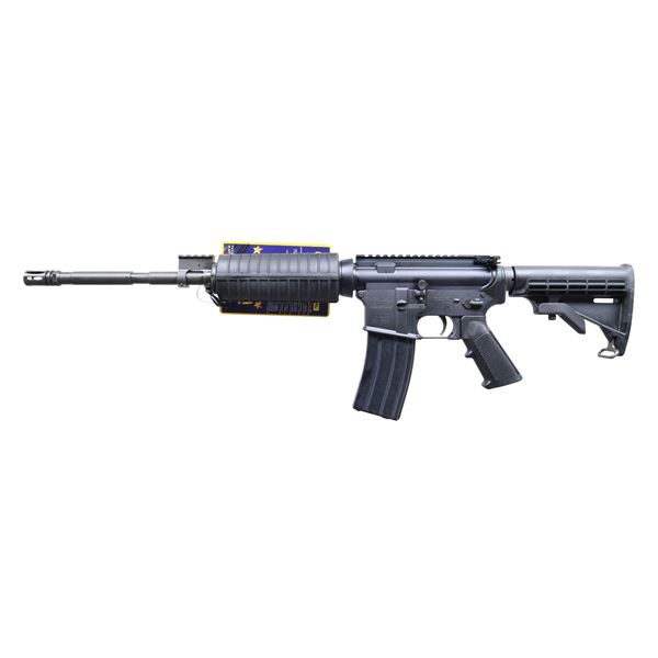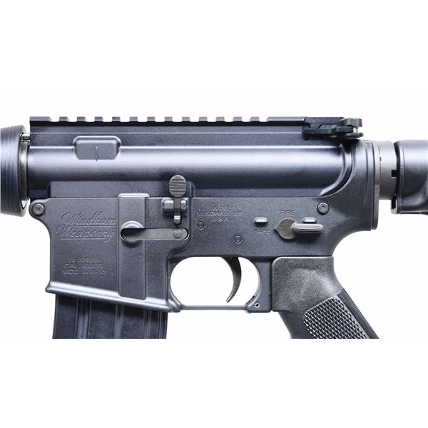 SEMI-AUTOMATIC RIFLE WITH HARD CASE & MATCHING BOX. Cal. 5.56mm. S# YE034609. Bbl. 16 1/2". Model WW-15 semi-automatic rifle mfg. by Windham Weaponry. Left side of the receiver exhibits standard markings denoting the S#, model and cal. designations, as well as Windham's mfg. information. Top of the M4 profile bbl. is marked "WW 5.56 1/9". Aluminum receiver and flat top upper exhibit a matte black finish, with the bbl. and gas block exhibiting a parkerized finish. Black polymer adj. buttstock, with A2 pattern checkered pistol grip, and short ribbed handguards. MAGS: 1 factory aluminum 30-rd. UNATTACHED ACCESSORIES: matching cardboard box, containing a black plastic hard case. CONDITION: near new, with metal components retaining virtually all of their original factory finishes overall. Brilliant mirror chrome lined bore, retaining well defined rifling throughout. Black polymer furniture is excellent overall. Box shows some light to mild wear from handling and storage, but otherwise remains sturdy and serviceable. (24-7068/MLW). MODERN. $400-600.