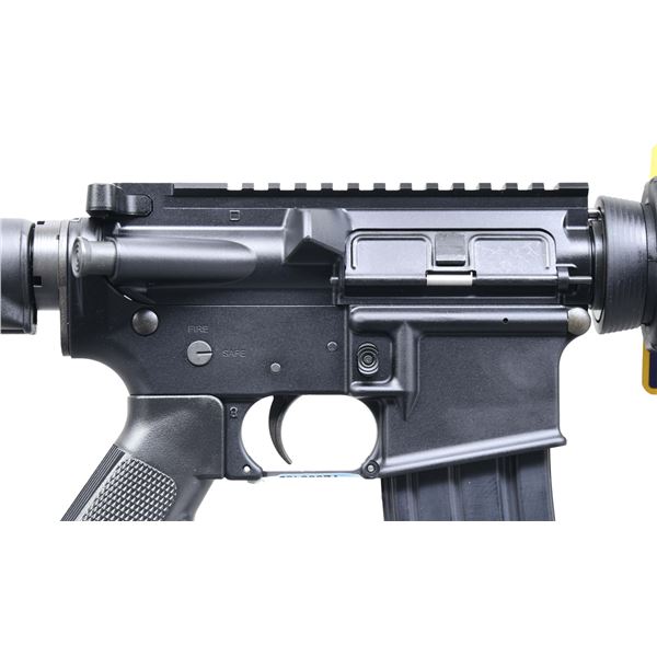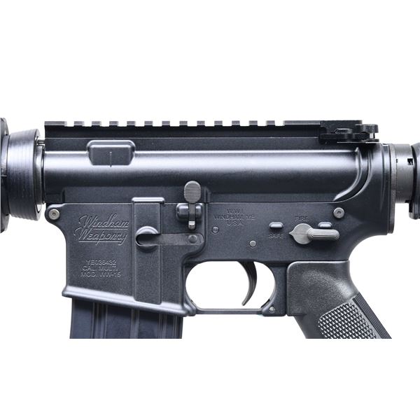 SEMI-AUTOMATIC RIFLE WITH HARD CASE & MATCHING BOX. Cal. 5.56mm. S# YE036432. Bbl. 16 1/2". Model WW-15 semi-automatic rifle mfg. by Windham Weaponry. Left side of the receiver exhibits marking stipulating the S#, model and cal. designations, as well as Windham's mfg. information. Top of the M4 profile bbl. is marked "WW 5.56 1/9". Aluminum receiver and flat top upper exhibit a matte black finish, with the bbl. and gas block exhibiting a parkerized finish. Black polymer adj. buttstock, with A2 pattern checkered pistol grip, and short ribbed handguards. MAGS: 1 factory aluminum 30-rd. UNATTACHED ACCESSORIES: matching cardboard box, containing a black plastic hard case. CONDITION: near new, with metal components retaining virtually all of their original factory finishes overall. Front sling loop retains its factory hang tag. Mirror chrome lined bore, retaining well defined rifling throughout. Black polymer furniture is excellent overall. Box shows some light to mild exterior wear, but otherwise remains sturdy and serviceable. (24-7072/MLW). MODERN. $400-600.
