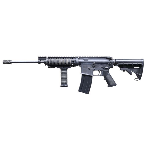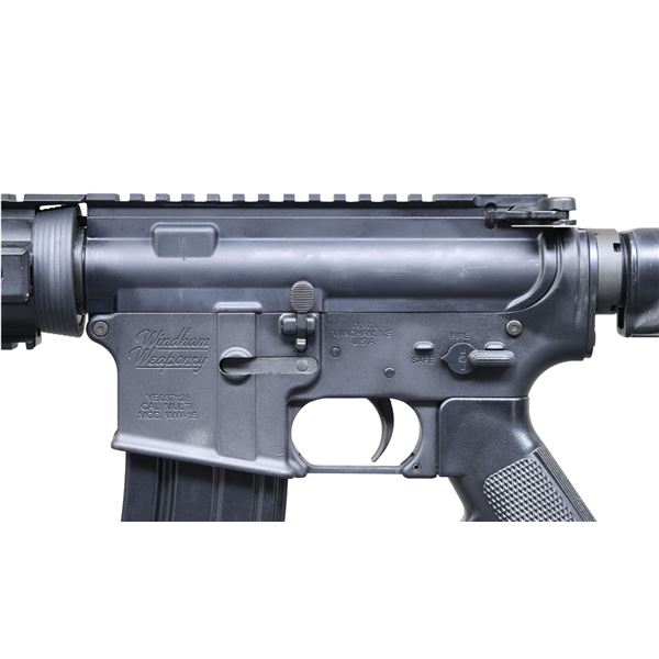 SEMI-AUTOMATIC RIFLE WITH HARD CASE. Cal. 5.56mm. S# YE037128. Bbl. 16 1/2". Model WW-15 semi-automatic rifle mfg. by Windham Weaponry. Left side of the receiver exhibits standard markings denoting the S#, model and cal. designations, as well as Windham's mfg. information. Top of the bbl. is marked "WW 5.56 1/9". Aluminum receiver, flat top upper, and aftermarket quad rail handguard exhibit a matte black finish, with the bbl., bird cage flash hider, and gas block exhibiting a blue finish. Black polymer adj. buttstock, A2 pattern checkered pistol grip, and Stark vertical foregrip. MAGS: 1 factory aluminum 30-rd. UNATTACHED ACCESSORIES: black plastic hard case. CONDITION: good, with metal components retaining the majority of their original factory finishes, exhibiting some spots of light wear from use, as well as some scattered superficial handling marks overall. Mirror chrome lined bore, exhibiting some firing residue, while retaining well defined rifling throughout. Black polymer furniture shows some scattered superficial marks from handling and storage, but otherwise remains sturdy and serviceable. (24-7082/MLW). MODERN. $400-600.