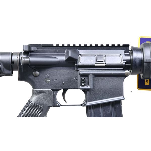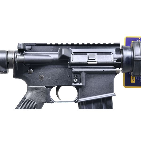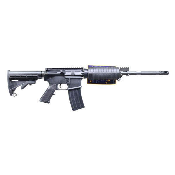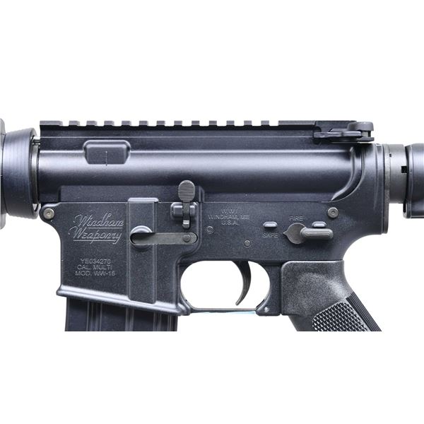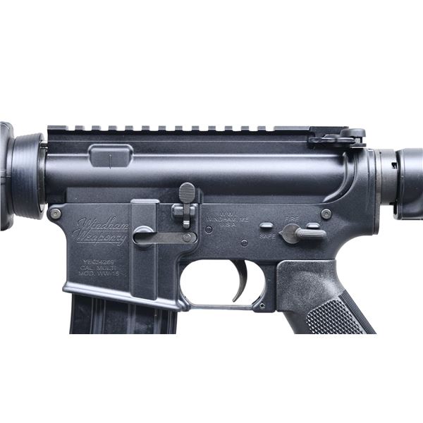 AUTOMATIC RIFLES WITH MATCHING BOXES. 1) Cal. 5.56mm. S# YE034269. Bbl. 16". Model WW-15 semi-automatic rifle mfg. by Windham Weaponry. Left side of the receiver exhibits standard markings, stipulating Windham's mfg. information, the model and cal. designations, as well as the S#. Top of the bbl. is marked "WW 5.56 1/9". Aluminum receiver and flat-top upper assembly exhibit a matte black finish, with the bbl. and gas block exhibiting a parkerized finish. Black polymer collapsible buttstock with A2 pattern pistol grip and short ribbed handguard. MAGS: One aluminum 30-rd. UNATTACHED ACCESSORIES: Black plastic hard case with matching cardboard box. CONDITION: Near new, with metal components retaining virtually all of their original factory finishes overall. Front sling loop retains its Windham Weaponry tag. Mirror chrome-lined bore, retaining well-defined rifling throughout. Black polymer furniture is excellent. Box shows some light exterior wear from handling and storage, but otherwise remains sturdy and serviceable. (24-7061/MLW). MODERN. 2) Cal. 5.56mm. S# YE034270. Bbl. 16 1/2". Model WW-15 semi-automatic rifle mfg. by Windham Weaponry. Left side of the receiver exhibits standard markings denoting the S#, model and cal. designations, as well as Windham's mfg. information. Top of the bbl. is marked "WW 5.56 1/9". Aluminum receiver and flat top upper exhibit a matte black finish, with the bbl. and gas block exhibiting a parkerized finish. Black polymer adj. buttstock, with A2 pattern pistol grip, and short ribbed handguard. MAGS: 1 factory aluminum 30-rd. UNATTACHED ACCESSORIES: matching cardboard box, containing black plastic hard case. CONDITION: near new, with metal components retaining virtually all of their original factory finishes overall. Front sling loop retains its factory hang tag. Brilliant mirror chrome lined bore, retaining well defined rifling throughout. Black polymer furniture is excellent overall. Box shows some light to mild exterior wear, but otherwise remains sturdy and serviceable. (24-7071/MLW). MODERN. $800-1,200.