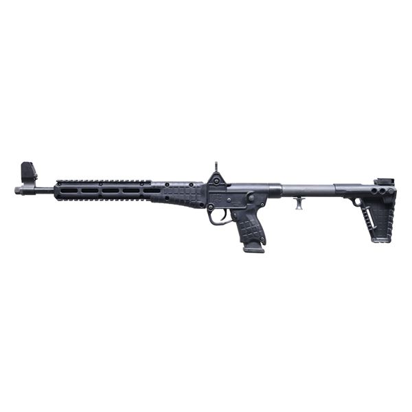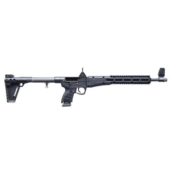 RIFLE WITH MATCHING FACTORY BOX. Cal. 9mm Luger. S# FH2V91. Bbl. 16 1/4". 2nd Generation Sub-2000 semi-automatic rifle mfg. by Kel-Tec. Standard markings overall, denoting the model and cal. designations, as well as Kel-Tec's mfg. information. Metal components exhibit a blue finish overall. Black polymer Glock 19/23 compatible frame, with black polymer furniture, and Gen 2 forend featuring M-LOK slots and a picatinny rail on the top and bottom. Open top post front sight, with peep rear sight. Threaded bbl. MAGS: 1 17-rd. PMAG. UNATTACHED ACCESSORIES: matching factory box. CONDITION: good, with metal components retaining the majority of their original factory blue finish, exhibiting some light wear and some superficial marks from handling and storage overall. Mirror bore, exhibiting some firing residue, while retaining well defined rifling throughout. Black polymer furniture is very good overall. Box is very good overall. (24-7053/MLW). MODERN. $300-400.