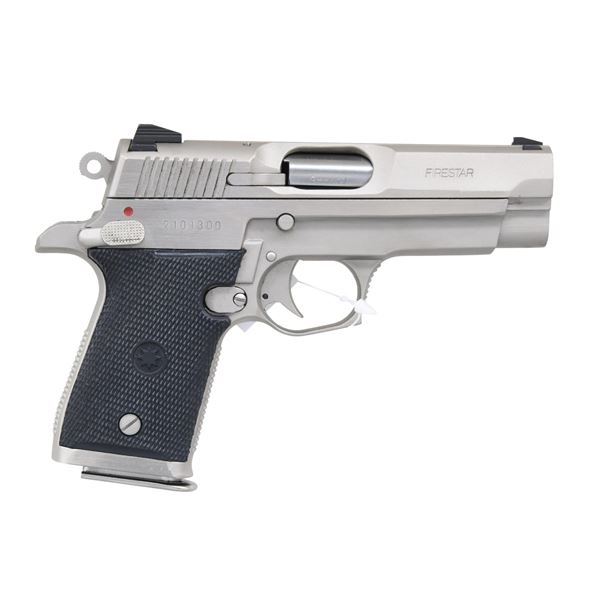 SEMI-AUTOMATIC PISTOL WITH MATCHING HARD CASE. Cal. 9x19mm. S# 2101300. Bbl. 3 3/8". M42 "Firestar" semi-automatic pistol mfg. in Spain by Star and imported by Interarms. The left side of the slide is marked with the Star logo, followed by "STAR" and "EIBAR/ SPAIN", with "FIRESTAR" marked on the right. Left side of the frame is marked with Interarms' importer information, with the S# marked on the right. Metal components exhibit a 2-tone stainless steel finish, save for on the bbl. which is blued and features a chamber that is polished in-the-white. Frame is mounted with 2-piece Star logo checkered black rubber grips. Standard white dot front sight, with 2-dot square notch rear sight. 1 7-rd. UNATTACHED ACCESSORIES: factory hard case, with matching Interarms' end label. Hard case contains factory paperwork, a cleaning rod, and a disassembly tool. CONDITION: excellent, with metal components retaining bountiful amounts of their original factory finishes overall. Brilliant mirror bore, retaining sharp and well defined rifling throughout. Grips are excellent. Hard case is very good overall. A fine example of a Star M43 "Firestar" semi-automatic pistol. PROVENANCE: The Estate Collection of Charles Wagner. (25-312/MLW). MODERN. $300-500.