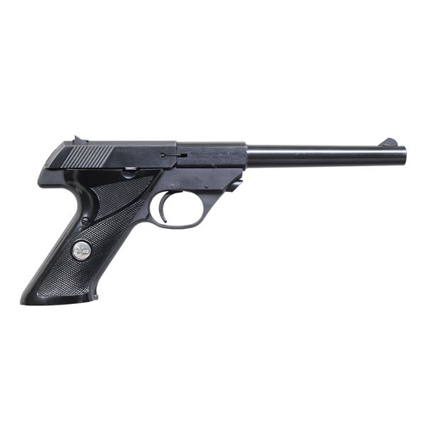 Cal. 22 LR. S# G09233. Bbl. 6 3/4". Serrated blade front sight. Square notch rear sight. Hamden, CT made Sport King pistol. Blued finish. Checkered grips with High Standard medallions. MAGS: 1-10 rd. UNATTACHED ACCESSORIES: matching numbered factory box in fair condition with a drawing on the top of an AR style rifle. Also included are box inserts & manual. CONDITION: grips show light handling marks. Metal retains 92% original blue with a few spots of oxidation, scattered handling marks & edge wear. Action functions properly when hand cycled. Bright near excellent bore. (25-578/MJC). CURIO. $400-600.
