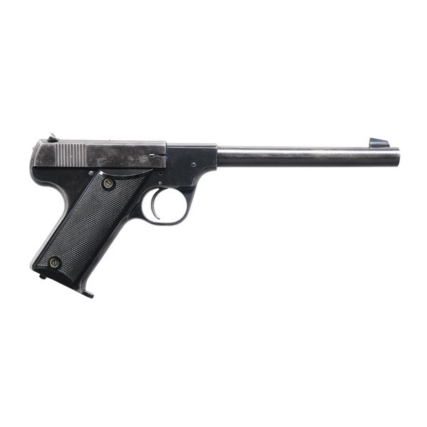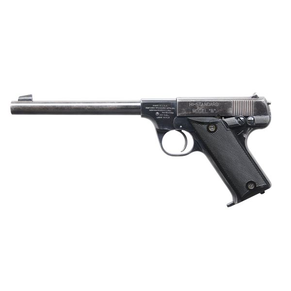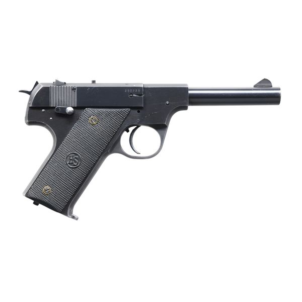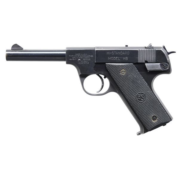 BOTH: Cal. 22 LR. Blued finishes with checkered hard rubber grips. Left side thumb safety levers and mag. latches on butts. Matching numbered slides. MAGS: 2 TOTAL 10 rd. (same mag. for each pistol); original 2 tone mags in very good condition. 1.) MODEL HB. S# 292223. Bbl. 4 1/2" with serrated angled blade front sight plus slide mounted windage adjustable rear. Mfg. 1948-1949 as Model #9003 being post war hammer version of Model B. Second model with exposed safety lever, over travel stop for trigger, HS logo on grips, right side takedown lever and exposed hammer. CONDITION: very good finish with thinning in grip area plus at high points. Light handling marks to include evidence of prior trigger shoe installation. Near excellent bore. (24-7227/NW). 2.) MODEL B. S# 8280. Bbl. 6 3/4" with serrated Patridge blade front sight plus slide mounted windage adjustable rear. Type I-A takedown assembly having round rod at rear of slide plus takedown lever and safety on left side of frame. Made 1932-1942 as Model 9001 have earlier border checkered grips without HS logo. CONDITION: good appearance with thinning finish having peppery oxidation plus some light handling marks. Near excellent bore and grips. (24-7230/NW). BOTH CURIO. $ 650-900 FOR BOTH.