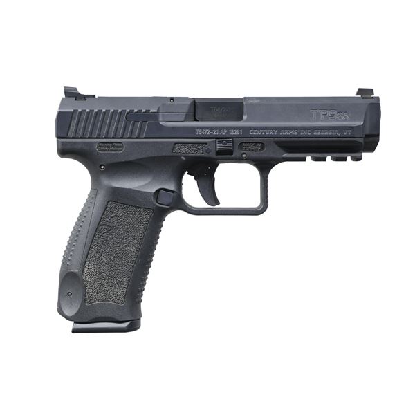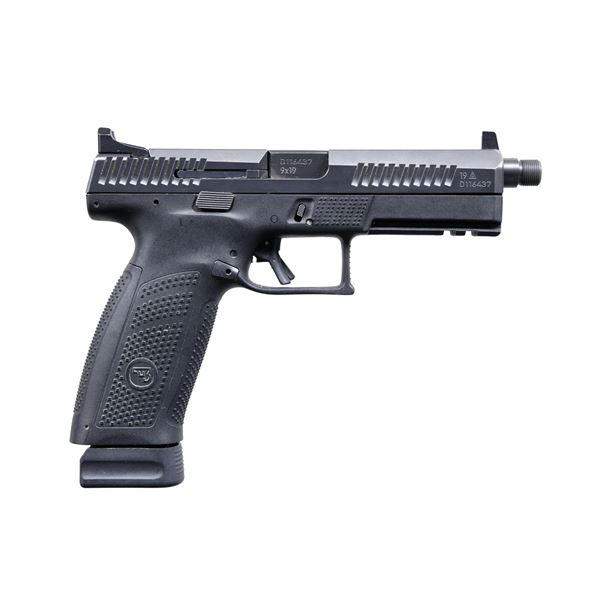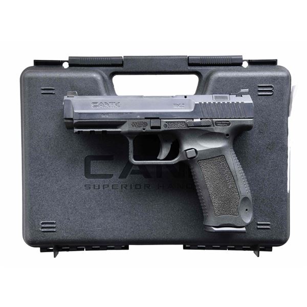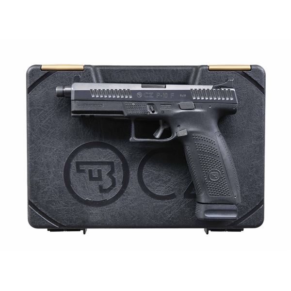 HARD CASES. 1) CZ MODEL P-10F. Cal. 9x19mm. S# D116437. Bbl. 5". Model P-10F semi-automatic pistol mfg. in the Czech Republic by CZ and imported by CZ-USA. Left side of the slide is marked with the CZ logo, followed by the model and cal. designations, with the S# marked on the right. Slide and threaded bbl. exhibit a blue finish. Textured black polymer frame. Raised white dot front sight with raised square notch rear sight. All serialized parts are matching and include the frame, slide, and bbl. MAGS: two 18-rd. UNATTACHED ACCESSORIES: Matching factory hard case. CONDITION: Good, with some spots of light to mild wear overall. Mirror bore, exhibiting some firing residue, while retaining strong rifling throughout. Frame shows a few scattered marks from handling and storage, but otherwise remains sturdy and serviceable. (24-7036/MLW). MODERN. 2) CANIK TP9SA MODEL 2. Cal. 9x19mm. S# 21AP18281. Bbl. 4 3/8". TP9SA Model 2 semi-automatic pistol mfg. in Turkey and imported by Century Arms. Left side of the slide is marked "CANIK" above the cal. designation, followed by "Mod.2", with the model designation, S#, and Century Arms' importer information marked on the right. Metal components exhibit a dull blue finish. Textured black polymer frame, featuring a picatinny rail, just forward of the trigger guard. White dot blade front sight with U-notch rear sight. All serialized parts are matching and include the frame, slide, and bbl. MAGS: two 18-rd. UNATTACHED ACCESSORIES: Matching black hard case, containing a black polymer holster and mag. loader. CONDITION: Very good, with metal components retaining the majority of their original factory finish, exhibiting some light surface oxidation and a few superficial handling marks overall. Mirror bore, exhibiting some spots of hardened firing residue, while retaining strong rifling throughout. Polymer frame shows a few light marks from handling and storage, but otherwise remains sturdy and serviceable. (24-7037/MLW). MODERN. $700-1,100.