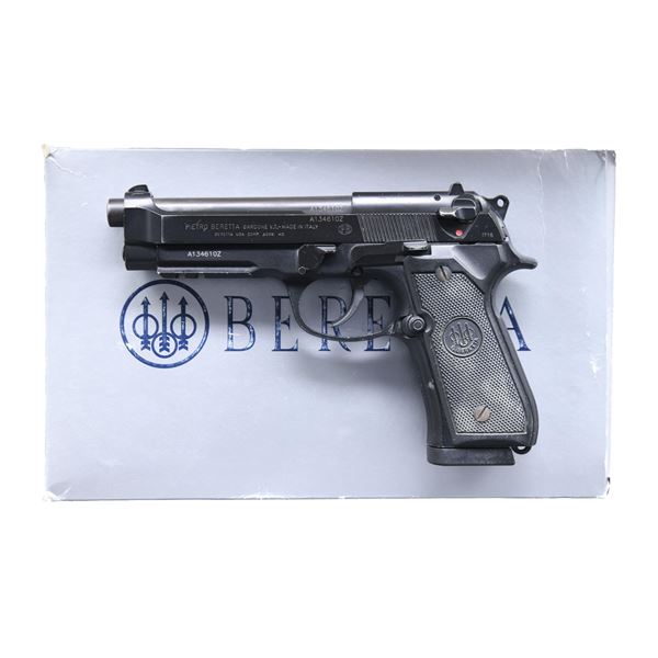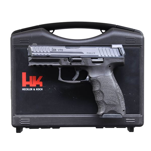 1) BERETTA MODEL 92A1 WITH FACTORY BOX & HARD CASE. Cal. 9x19mm. S# A134610Z. Bbl. 4 7/8". Model 92A1 semi-automatic pistol mfg. in Italy by Beretta and imported by Beretta USA Corp. Left side of the slide is marked with Beretta's mfg. and importer information, with the model and cal. designations marked on the right. Steel slide exhibits a black enamel-type finish, with the bbl. exhibiting a dull blue finish. Aluminum frame exhibits a matte black finish. Frame is mounted with 2-piece Beretta logo checkered black polymer grips. Blade front sight, with square notch rear sight. MAGS: one 17-rd. UNATTACHED ACCESSORIES: Factory box (S# no longer legible) containing factory hard case. CONDITION: Good, with metal components retaining the majority of their original factory finishes, exhibiting some areas of mild thinning and wear, as well as some scattered superficial handling marks overall. Bbl. exhibits areas of light surface oxidation. Mirror bore, exhibiting some firing residue, while retaining strong rifling throughout. Grips are good, showing some scattered marks from handling and storage. Box exhibits mild exterior wear from handling and storage, but otherwise remains sturdy and serviceable. (24-7033/MLW). MODERN. 2) HECKLER & KOCH MODEL VP9 WITH MATCHING FACTORY HARD CASE. Cal. 9mm Luger. S# 224-250764. Bbl. 4". VP9 semi-automatic pistol mfg. in Germany by Heckler & Koch and imported by HKI. Standard markings on slide, denoting the model and cal. designations, as well as the S#. Slide exhibits a matte black finish, with the bbl. exhibiting a dull blue finish. Textured black polymer frame. White dot front sight with 2-dot square notch rear sight. MAGS: two 15-rd. mags. and one 17-rd. mag. UNATTACHED ACCESSORIES: Matching factory hard case. CONDITION: Good, with metal components retaining the majority of their original factory finishes, exhibiting some light to mild wear, as well as some superficial handling marks overall. Mirror bore, retaining strong polygonal rifling throughout. Frame is good, showing some superficial marks from handling and storage. Mag. shows areas of wear that show through to silvering. (24-7034/MLW). MODERN. $600-1,000.