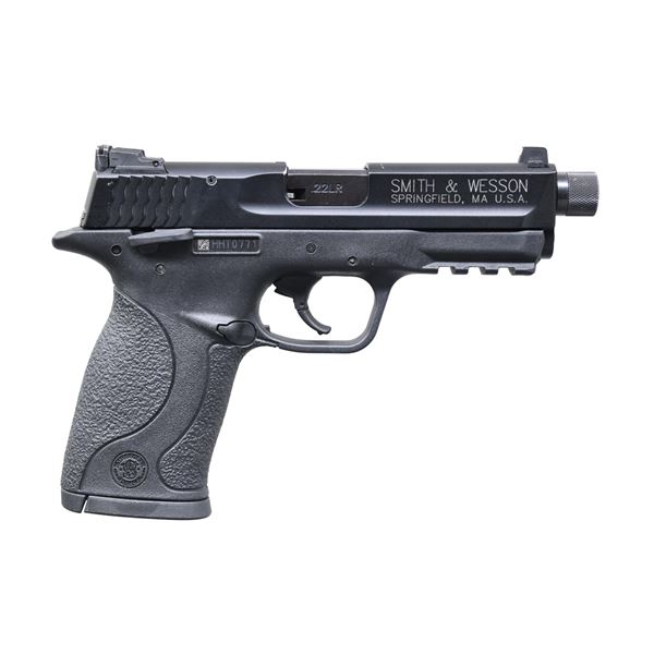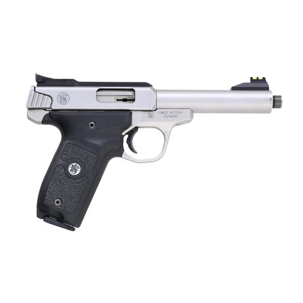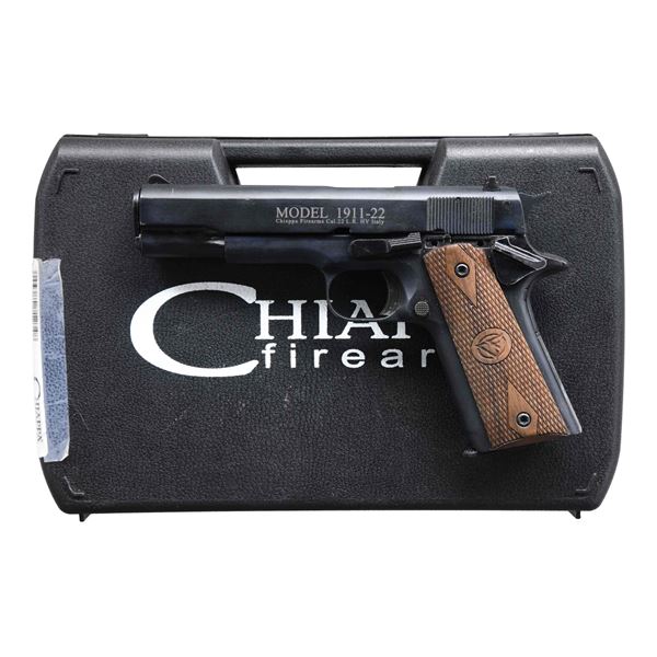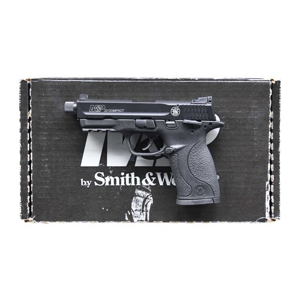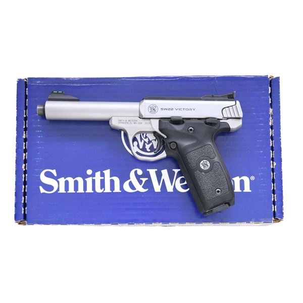 1) SMITH & WESSON MODEL SW22 VICTORY WITH MATCHING FACTORY BOX. Cal. 22 LR. S# DJY4093. Bbl. 5 1/2". Model SW22 Victory semi-automatic pistol mfg. by Smith & Wesson. Sides of the slide are marked with the S&W trademark logo, with the left side also being marked "SW22 VICTORY". Left side of the frame is marked with S&W's mfg. information and the cal. designation, with the model designation and S# marked on the right. Metal components exhibit a stainless steel finish overall. Black polymer grip frame. Green fiber optic front sight with green fiber optic square notch rear sight. Muzzle thread protector is absent. MAGS: two 10-rd. UNATTACHED ACCESSORIES: Matching factory box, containing a black polymer picatinny rail. CONDITION: Very good, with metal components retaining bountiful amounts of their original factory stainless steel finish, exhibiting some scattered superficial handling marks overall. Mirror bore, exhibiting some areas of firing residue, while retaining strong rifling throughout. Polymer grip frame is very good overall. Box shows some mild exterior wear from handling and storage, but otherwise remains sturdy and serviceable. (24-7029/MLW). MODERN. 2) SMITH & WESSON MODEL M&P 22 COMPACT WITH MATCHING FACTORY BOX. Cal. 22 LR. S# HHT0771. Bbl. 4 1/8". M&P 22 Compact semi-automatic pistol mfg. by Smith & Wesson. Left side of the slide is marked "M&P", followed by "22 COMPACT" and the S&W trademark logo, with S&W's mfg. information marked on the right. Aluminum slide exhibits a matte black finish, with the bbl. exhibiting a dull blue finish. Textured black polymer frame. White dot front sight, with 2-dot square notch rear sight. MAGS: 1 10-rd. UNATTACHED ACCESSORIES: matching factory box. CONDITION: good, with metal components retaining the majority of their original factory finishes, exhibiting some light to mild wear and thinning (on the bbl.), as well as some scattered superficial handling marks overall. Mirror bore, exhibiting strong rifling throughout. Threaded bbl. end exhibits areas of hardened carbon, with a small burr at the chamber, which does not effect serviceability. Frame is very good overall. Box shows some exterior wear from handling and storage, but otherwise remains sturdy and serviceable. (24-7030/MLW). MODERN. 3) CHIAPPA MODEL 1911-22 WITH MATCHING FACTORY HARD CASE. Cal. 22 LR. S# CF-IT-19PO4073. Bbl. 5". Model 1911-22 semi-automatic pistol in Italy by Chiappa and imported by Chiappa Firearms LTD. Left side of the slide is marked with the model and cal. designations. Right side of the frame is marked with Chiappa's importer information, Italian proofs, as well as the S#. Metal components exhibit a matte black finish overall. Frame is mounted with 2-piece checkered wood grips. Ramp blade front sight with square notch rear sight. Thumb safety plunger assembly is absent. MAGS: one 10-rd. UNATTACHED ACCESSORIES: Matching factory hard case. CONDITION: Good, with metal components retaining the majority of their original factory finishes, exhibiting some areas of wear and some scattered superficial handling marks overall. Mirror bore, retaining well-defined rifling throughout. Hammer and trigger are broken and do not function. Grips are very good overall. (24-7031/MLW). MODERN. $500-1,000.