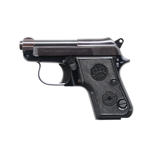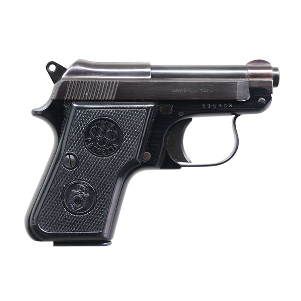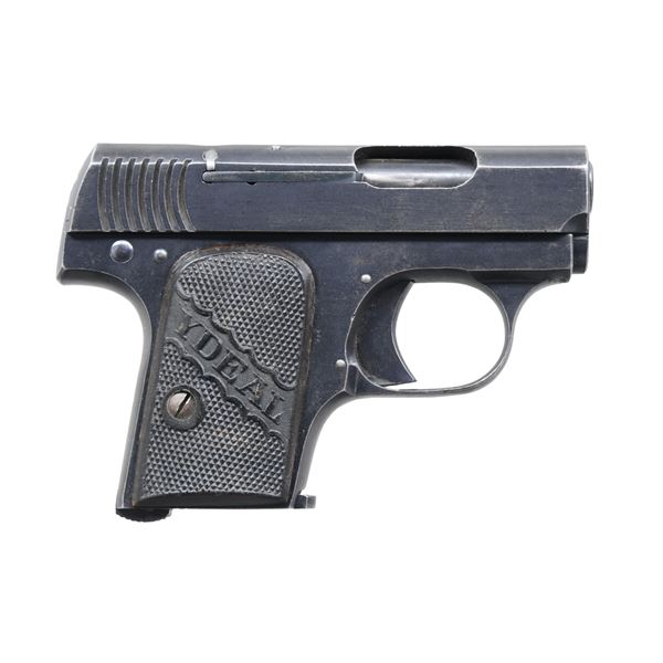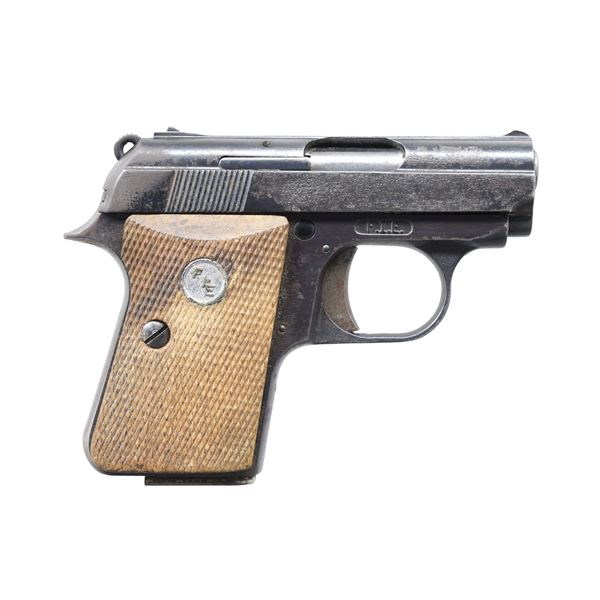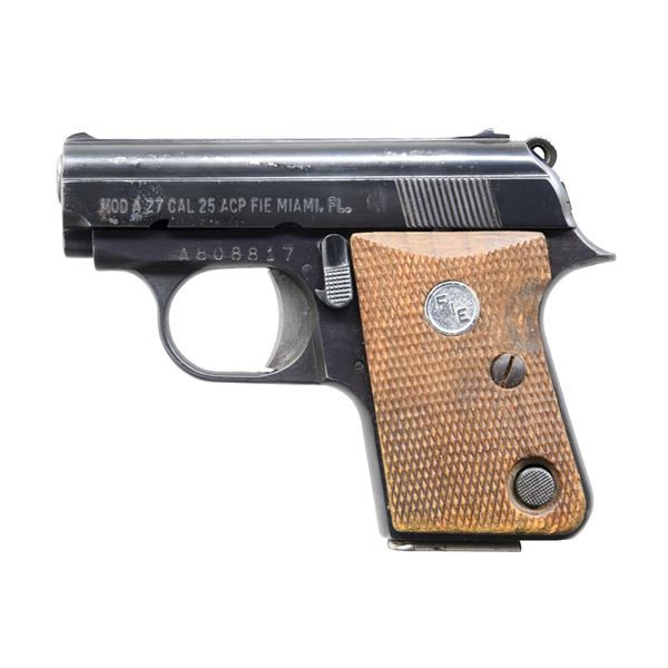 1) F.I.E. MODEL A27 SEMI-AUTOMATIC POCKET PISTOL. Cal. 25 ACP. S# A808817. Bbl. 2 1/8". Model A27 semi-automatic pistol mfg. in Spain and imported by F.I.E. Left side of the slide is marked with the model and cal. designations, followed by FIE's importer information. Left side of frame is marked with the S#, with "F.I.E." marked on the right. Metal components exhibit a blue finish overall. Frame is mounted with 2-piece "F.I.E." silver medallion checkered wood grips. MAGS: 1 6-rd. CONDITION: metal components retain good amounts of their original factory blue finish, exhibiting areas of wear and thinning overall, with varying degrees of pitting and oxidation present primarily on the right side. Bright bore, exhibiting what appear to be some oxidation, while retaining strong rifling throughout. Grips show smoothing and scattered marks from handling and storage, but otherwise remain sturdy and serviceable. (24-7197/MLW). MODERN. 2) SPANISH IDEAL SEMI-AUTOMATIC VEST POCKET PISTOL. Cal. 25 ACP. S# 7799. Bbl. 1 3/4". Ideal semi-automatic vest pocket pistol mfg. in Spain. Left side of the slide is marked "PISTOLET AUTOMATIQUE IDEAL" above Spanish proofs, and the S#. Metal components exhibit a blue finish overall. Frame is mounted with 2-piece "YDEAL" checkered brown grips. Frame, slide, and bbl. exhibit matching S#s and assembly #s. MAGS: 1 5-rd. CONDITION: metal components retain the majority of their original factory blue finish, exhibiting light to mild edge wear, some areas of wear and thinning, as well as some scattered spots of light surface oxidation and pitting. Very bright bore, exhibiting strong rifling throughout. Grips show some scattered marks from handling and storage, with a small chip present on the left panel. (24-7198/MLW). CURIO. 3) BERETTA MODEL 950B SEMI-AUTOMATIC PISTOL. Cal. 6.35mm. S# B75609. Bbl. 2 3/8". Model 950B semi-automatic pistol mfg. by Beretta in 1966. Left side of the slide is marked "P.BERETTA", followed by the model and cal. designations, with "MADE IN ITALY" marked on the right. Left side of the frame is marked with Italian proofs, with the S# marked on the right. Steel Slide and bbl. exhibit a blue finish, with the aluminum frame exhibiting a black anodized finish. Frame is mounted with 2-piece Beretta logo checkered black plastic grips. Half-moon blade front sight, with square notch rear sight. MAGS: 1 8-rd. CONDITION: very good, with metal components retaining bountiful amounts of their original factory finishes, exhibiting a few spots of light edge wear, as well as a few light superficial handling marks overall. Mirror bore, exhibiting well defined rifling throughout. Grips show some scattered marks from handling and storage, but otherwise remain sturdy and serviceable. (24-7235/MLW). CURIO. $400-650.