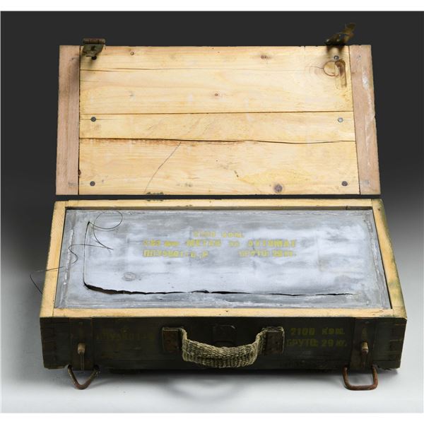 This lot consists of a crated tin of 2100 rds. of Yugo made 7.62x25 Tokarev ammo. Crate & tin have been opened but not ammo boxes. Ammo is undoubtedly corrosive. CONDITION: sealed in arsenal boxes. PROVENANCE: From the Estate of Ivan Lee Shapiro. (02-23495-8/MJC). AMMO. $400-600 for crate.