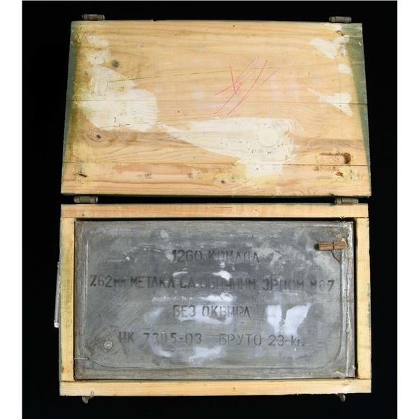 RIFLE AMMUNITION. Green wooden crate w/ steel fittings. Crate is marked in cyrillic & has several shipping labels attached. Crate of 1,260 rds contains 1 sealed can with 7.62x39 M67 ammunition. The ammunition is brass cased w/ corrosive berdan primers, loaded w/ 123 grain full metal jacket bullets. CONDITION: wooden crate has wear, splintered edges w/ flaking paint. The fittings & latches are functional & markings are generally legible. Ammunition not inspected due to sealed can. (02-23753/RW). AMMO. $500-800.