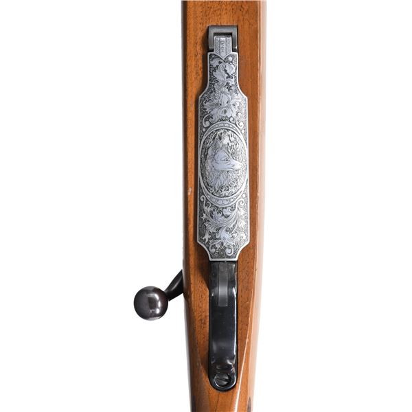Cal. 220 Swift. S# 72-52453. Bbl. 24" w/o sights. Weaver Micro-Trac K-6W gloss finished scope w/ duplex reticle on Ruger rings. Action has custom jeweled bolt & extractor. Floorplate is custom engraved w/ a wolf's head bordered by fine oak leaf engraving & stippled backgrounds. Engraver's signature "D.M.H." is found at front of floorplate. Top tang safety. Checkered walnut stock w/ red pad. CONDITION: bbl. & action have 95% blue showing muzzle wear w/ small marks. Original stock finish shows scattered scratches & marks. Very good bore. Scope has clear optics showing some blue wear. (24-3220/DS). MODERN. $600-900.