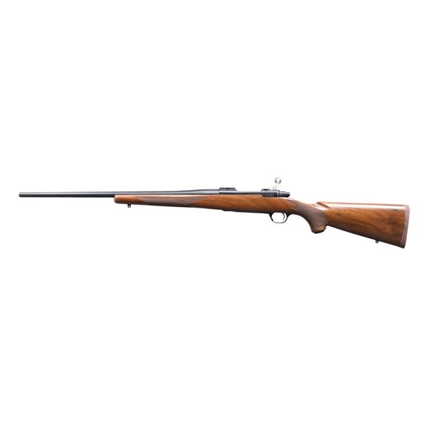 Cal. 7mm-08 Rem. S# 710-12405. Bbl. 22" without provision for sights; receiver factory machined for Ruger scope rings. Mfg. 2010 as matte blued (stainless bolt) with model number 07109 having checkered (wrap around on forend) walnut stock with grip cap, sling studs and red rubber buttpad. Floorplate engraved with "RUGER" and eagle logo. UNATTACHED ACCESSORIES: matching numbered factory box with packaging to include 1" factory scope rings. CONDITION: all aspects near excellent with new, unfired appearance. (24-3749/NW). MODERN. $500-750.