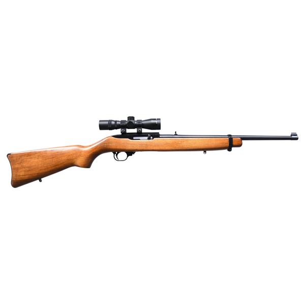 AUTO CARBINE. Cal. 22 LR. S# 115-78680. Bbl. 18 1/2" with banded brass bead front sight and folding leaf rear. Mfg. 1976 (1964 to date) as blued Bicentennial model with true walnut stock having black Celcon carbine buttplate and added sling studs. Ruger scope base with alloy 1" scope rings holding Bushnell .22 Varmint duplex reticle scope appearing to be 2 1/2 power. MAGS: 1 factory 10 rd. CONDITION: good to very good overall with extra finish added to stock set. Unconventional sling stud locations. Very minimal marks on barrel finish. Black paint added to receiver and trigger guard. Near excellent bore and scope set. (25-612/NW). MODERN. $150-250.
