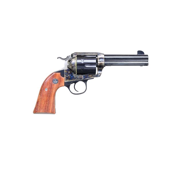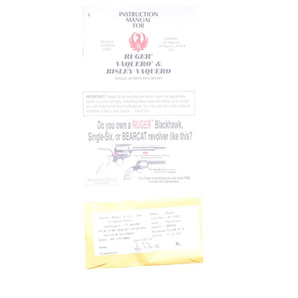 MATCHING FACTORY BOX. Cal. 45 Colt. S# 58-28642 (2002). Catalog No. RBNV-44. Bbl. 4.625" with a fixed front sight and a fixed rear sight. The Ruger Vaquero is a single-action revolver featuring a case-hardened finish on the frame and a blued finish on the bbl. and cyl. It has smooth wood grips with the Ruger emblem. The frame is a standard Ruger frame without special naming. The cylinder holds six rounds and is fluted. UNATTACHED ACCESSORIES: Factory box and instruction manual. CONDITION: The revolver is in near-excellent overall condition, with 98% of its original finish remaining. The barrel retains 98% of its blued finish; the frame also retains 98% of its case-hardened finish. The grips are in excellent condition. The bore is bright and shiny with strong rifling. (24-2967/MD). MODERN. $350-550.