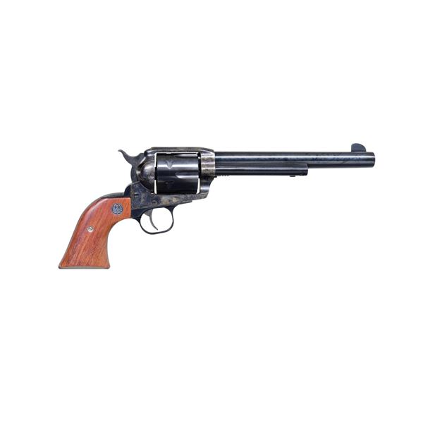 WITH FACTORY BOX. Cal. 44-40. S# 55-91049 (1995). Bbl. 7.5" with standard fixed sights. Case-hardened finish. Standard Ruger single-action frame and fluted six-shot cylinder. Smooth wood grips with Ruger medallions. UNATTACHED ACCESSORIES: Factory box. CONDITION: Overall near excellent condition, with approximately 98% of its original finish remaining on the bbl. and frame. The grips are near excellent with minimal wear. Bore is bright and sharp. (24-3013/MD). MODERN. $400-$600.