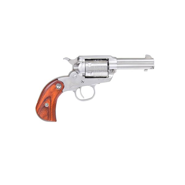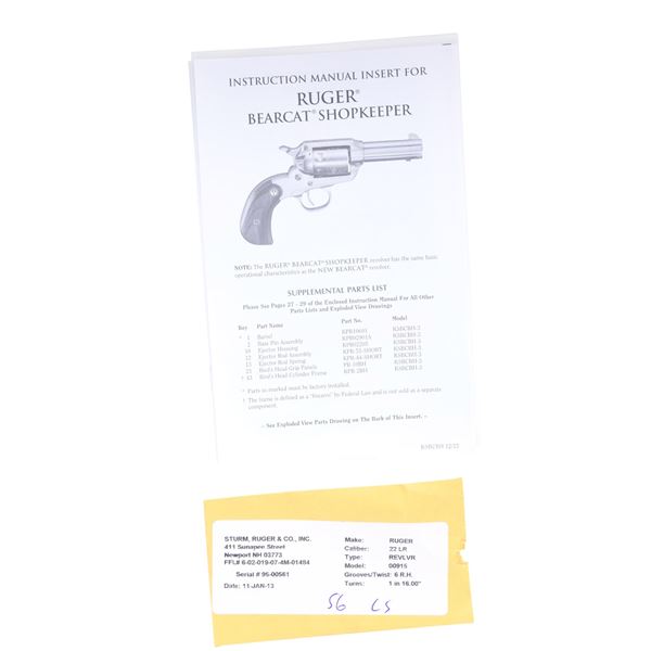 MODEL 00915 SAREVOLVER WITH MATCHING FACTORY BOX. Cal. 22 LR. S# 95-00561 (2013). Catalog No. KSBCBH-3 This revolver features a stainless steel finish with decorative scrollwork on the cylinder. Manufactured in 2013 with a 3-inch barrel. Fixed sights. The trigger is stainless, and the hammer is also stainless. The frame is of standard configuration. The cylinder holds six rounds and is not fluted. The grips are smooth wood with the Ruger emblem. UNATTACHED ACCESSORIES: Factory box and instruction manual. CONDITION: Overall condition is near excellent with approximately 99% of the original finish remaining on the barrel and frame. The grips are in near excellent condition with minimal wear. The bore is bright with strong rifling. MODERN (24-3007/MD) $300-500.