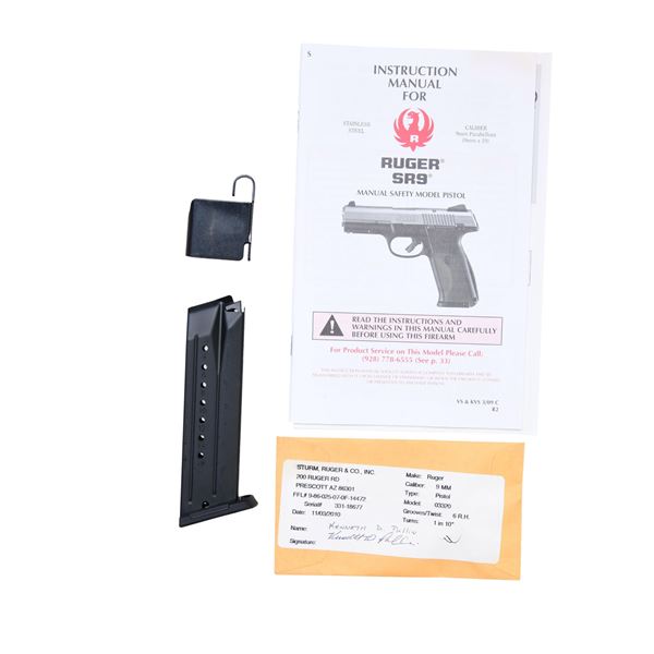 WITH MATCHING FACTORY BOX. Cal. 9x19 S# 331-18677 (2010). Catalog No. SR9-BI. Bbl. 4.14", with a fixed front sight and adjustable rear sight. This Ruger SR9 Black Ice features a black nitride and stainless finish with "Black Ice" and "Limited" engravings. The frame has a left-side thumb safety and a left-side magazine release. The grips are textured polymer. MAGS: Two 17-rd. UNATTACHED ACCESSORIES: Factory box, lock, manual, and paperwork. CONDITION: Overall near excellent condition. Slide retains approximately 98% of its original finish. Frame shows about 95% of its original finish. Bore is bright with strong rifling. (24-3466/MD). MODERN. $300-$500.