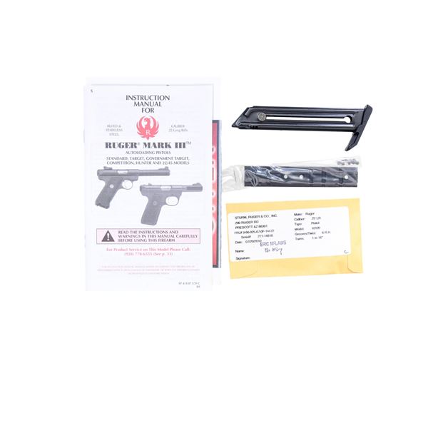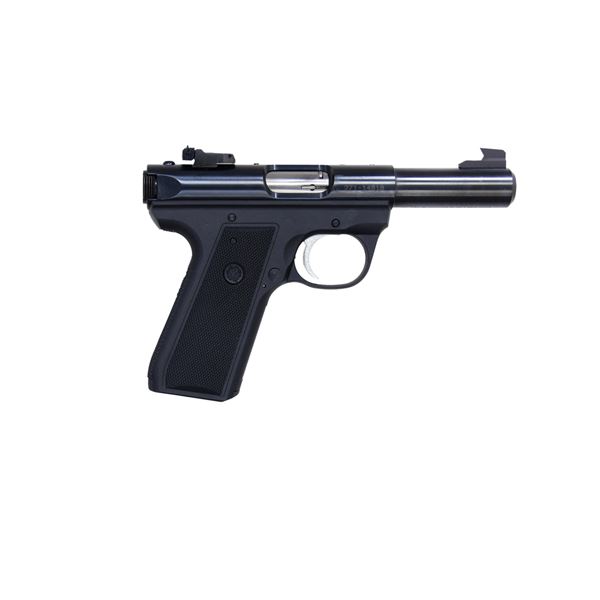 PISTOL WITH MATCHING NUMBERED BOX. Cal. 22 LR. S# 271-14818 (2010). Catalog No. P4MK3. Bbl. 4". This model features a blued finish with fixed sights and checkered grips. The frame includes a left-side safety and magazine release. MAGS: Two 10-rd. UNATTACHED ACCESSORIES: Factory box, instruction manual, and additional paperwork. CONDITION: Near excellent, with 95% of the finish remaining on the slide and frame. Bore is clean with sharp rifling. (24-3463/MD). MODERN. $300-400.