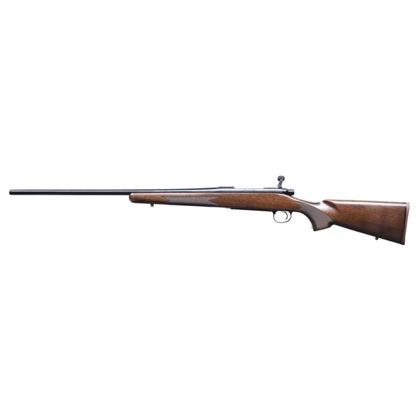 Cal. 8mm Mauser. S# G6366679. Bbl. 24". Rifle is made without sights. Receiver is drilled & tapped for scope mounting. Blued finish. Hinged floorplate. Checkered walnut stock with classic lines and Remington's solid red butt pad. Stock is fitted with swivel studs. UNATTACHED ACCESSORIES: matching cardboard shipping box containing owner's manual and two bolt shroud keys; the box is in very good condition with minor handling wear. CONDITION: all aspects, including bore, are near excellent; the rifle does not appear to have been fired. (24-3410/RW). MODERN. $500-700.