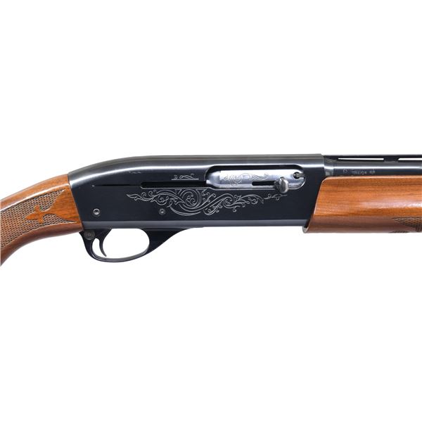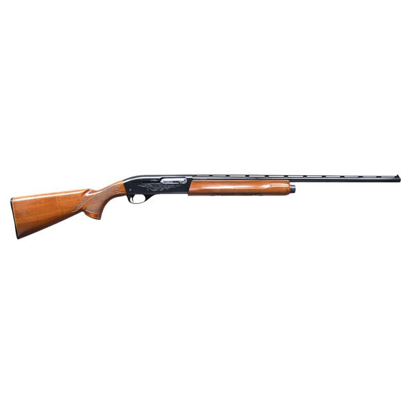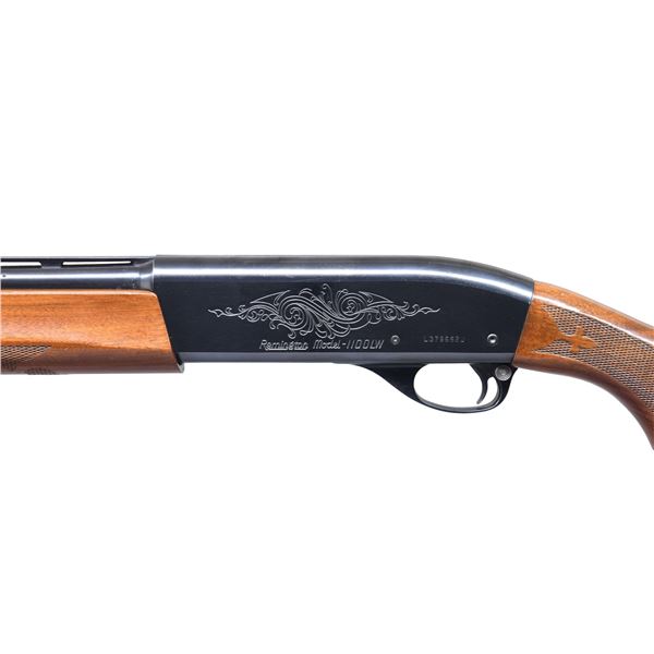 SEMI-AUTOMATIC SHOTGUN. Cal. 28 GA, 2 3/4". S# L379662J. Bbl. 25 1/8". Model 1100 Lightweight semi-automatic shotgun chambered in 28 GA mfg. by Remington. Left side of the bbl. is marked with the cal. designation, with "SKEET" marked towards the chamber. Right side of bbl. is marked with Remington's mfg. and patent information. Sides of receiver exhibit scroll engraving, with the Remington trademark logo, model designation, and S# marked on the left. Receiver and bbl. exhibit a blue finish, with the aluminum trigger guard exhibiting a black enamel type finish. Checkered wood Fleur-de-lis pistol grip buttstock and forend. Matte V/R with white plastic bead front sight. UNATTACHED ACCESSORIES: forend weight. CONDITION: very good, with metal components retaining bountiful amounts of their original factory finishes, exhibiting some very light edge wear, as well as a few light superficial handling marks overall. Mirror bore, exhibiting some firing residue. Wood furniture shows some scattered marks and impressions from handling and storage, but otherwise remains sturdy and serviceable. (25-534/MLW). MODERN. $800-1,200.
